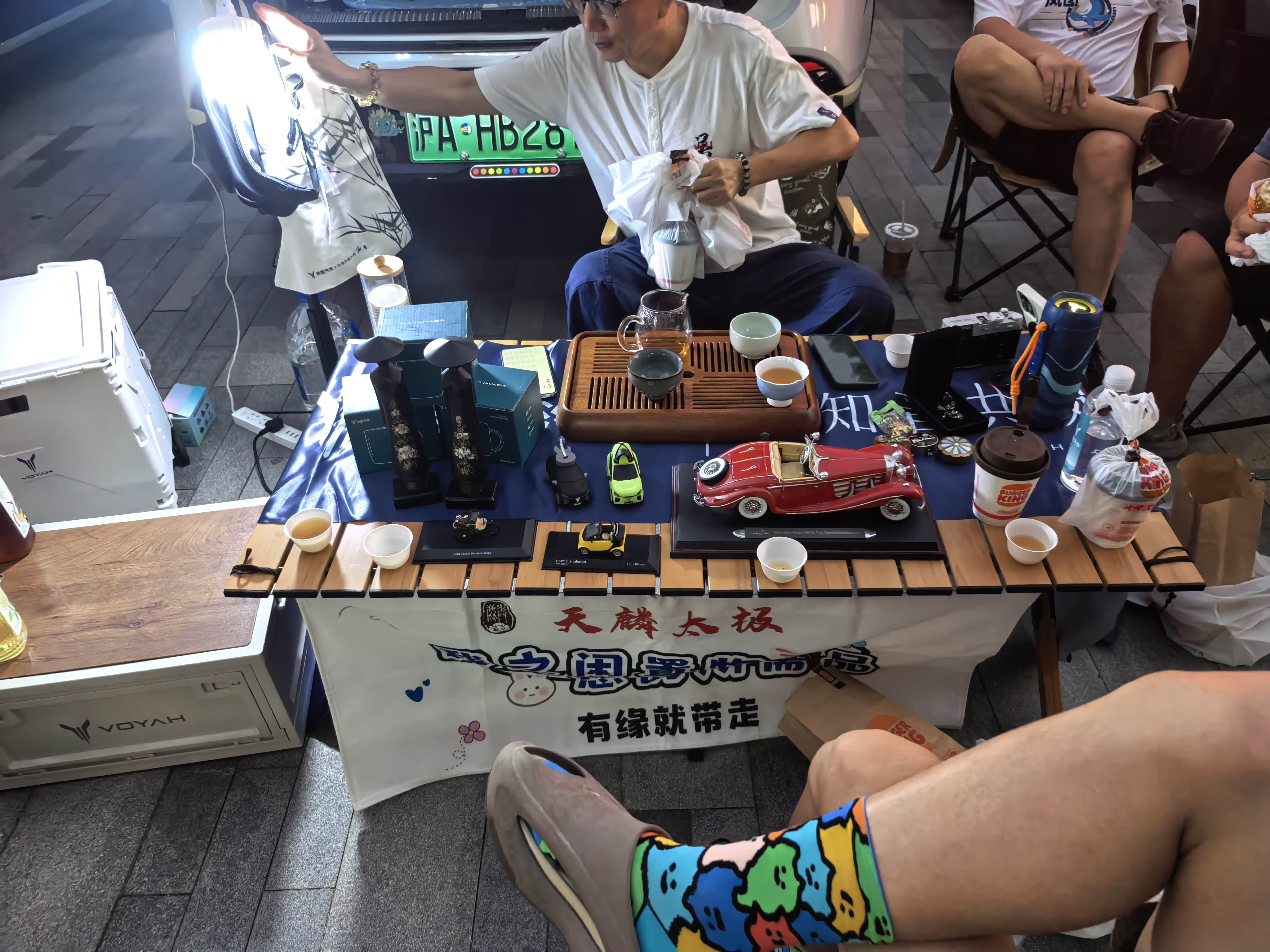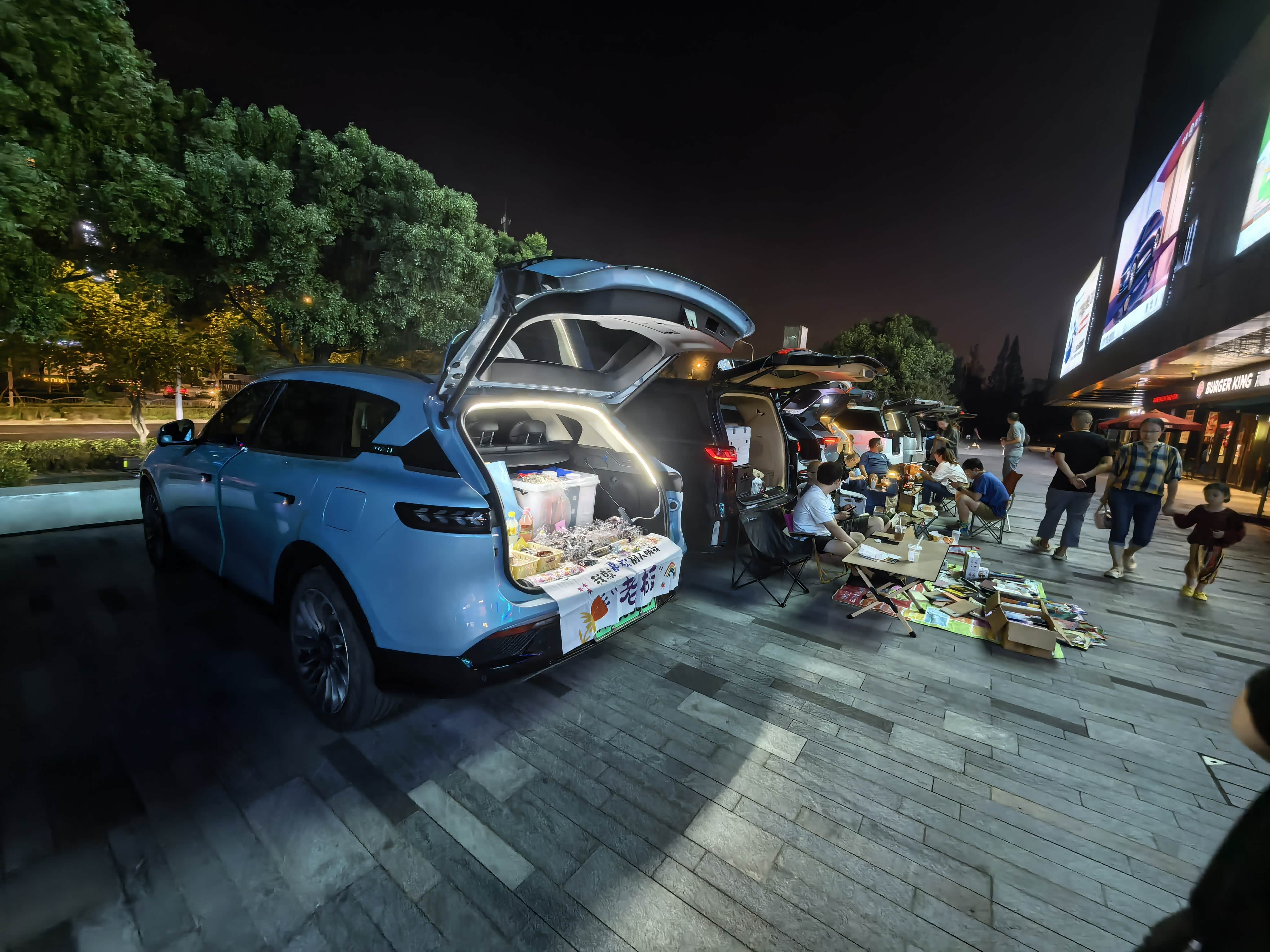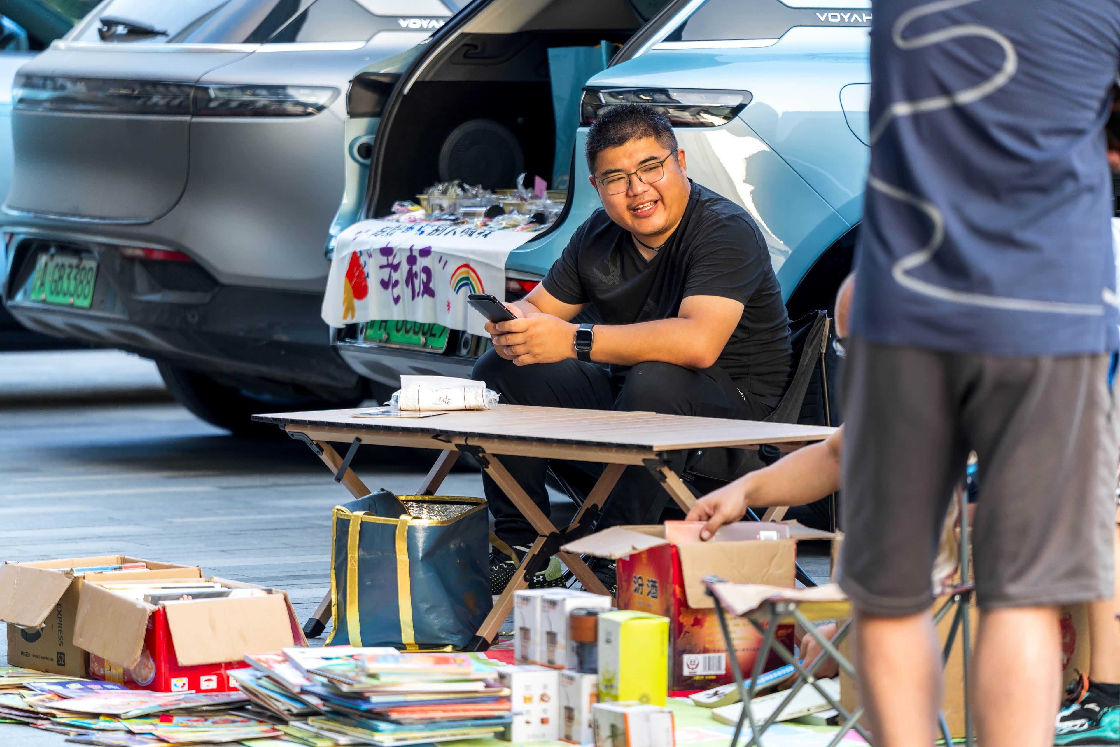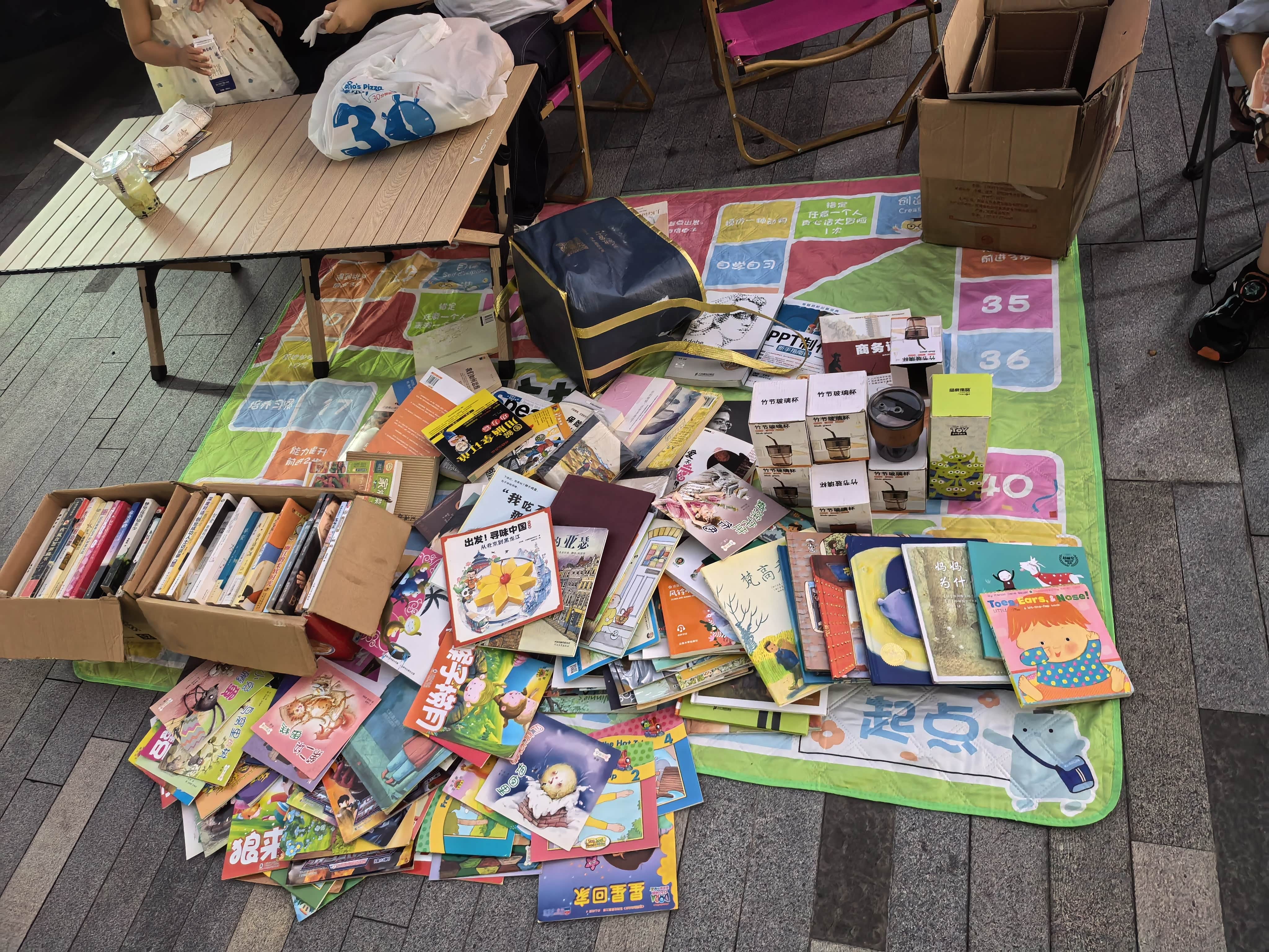 到了晚上七点多天慢慢黑了,商场灯光亮起来,集市氛围更浓了。有车友带了小音箱放轻快的歌,还有人拿零食出来分,我也把儿子爱吃的饼干跟旁边大姐分享。虽然我这边剩下的东西还不少,但一点都不着急,这种不图赚钱、只图凑个热闹做件好事的氛围,比单纯带娃逛街有意思多了。