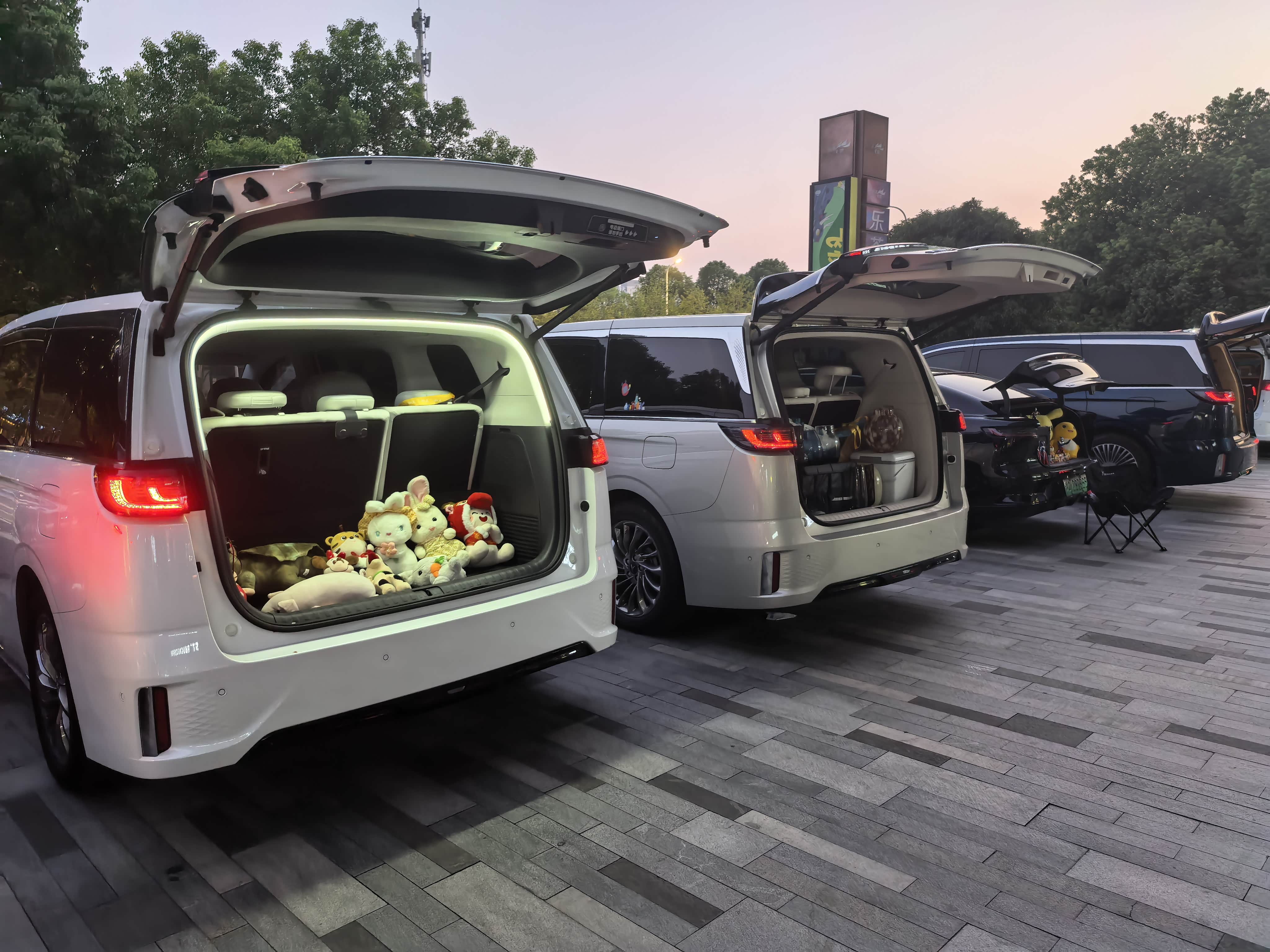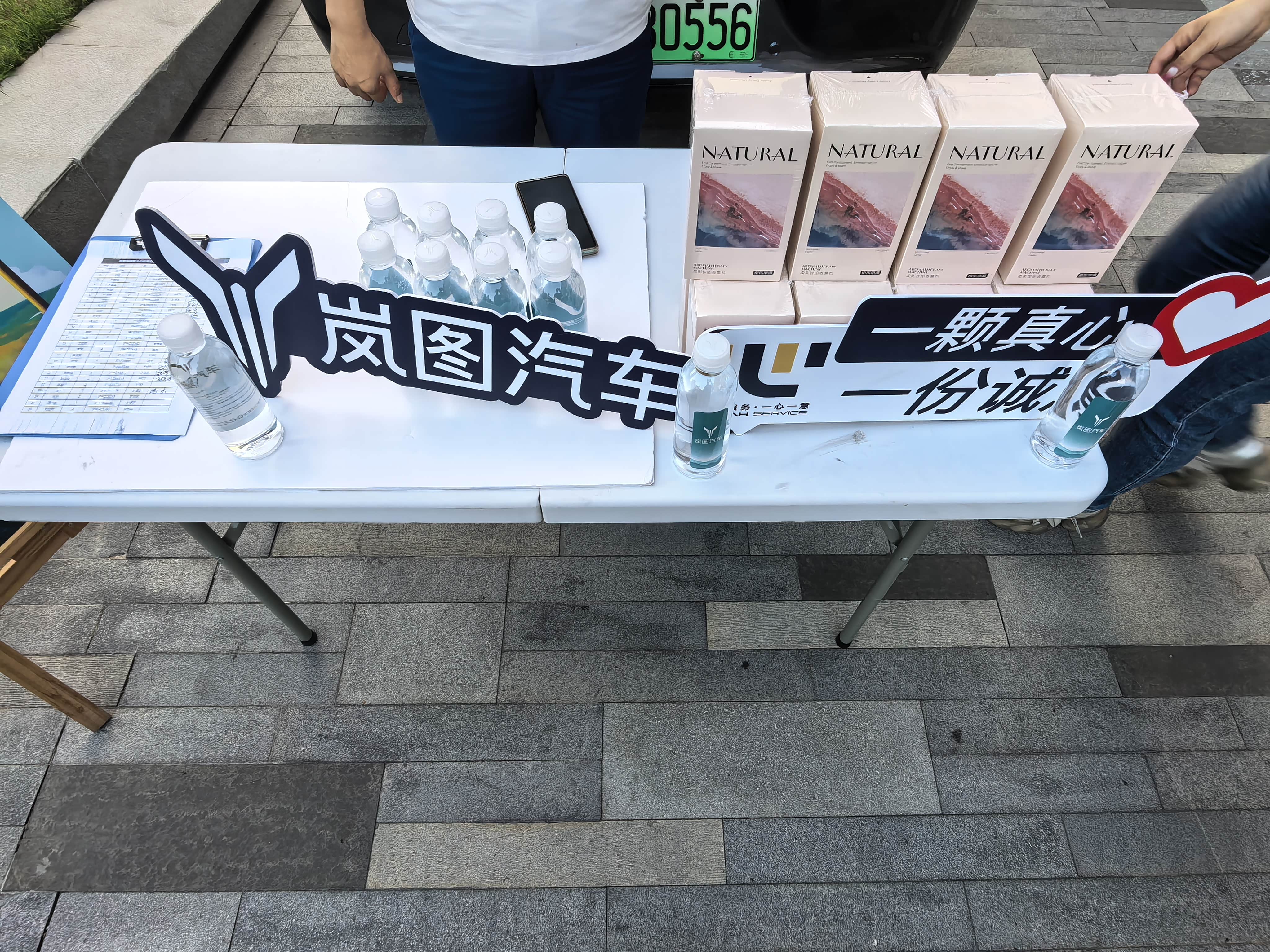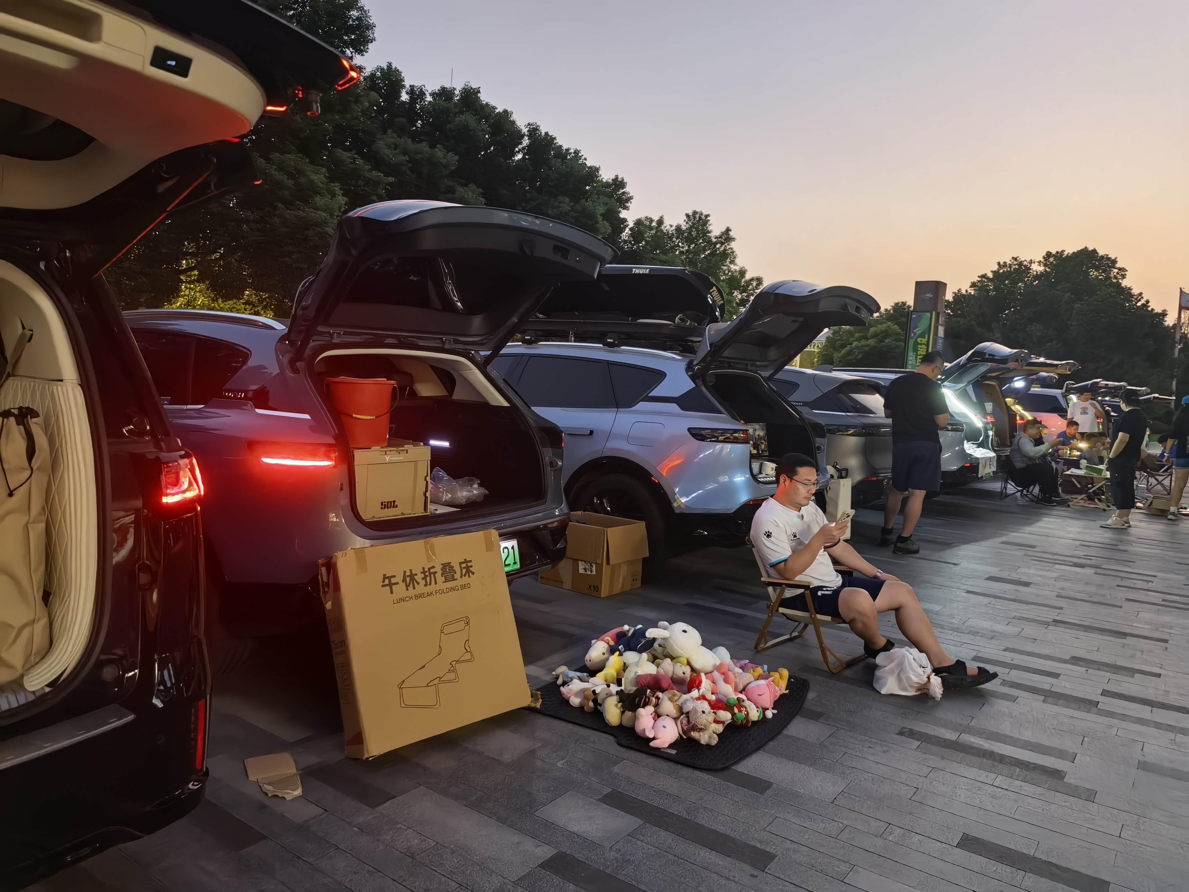 很多车友们也没闲着,没人逛的时候就互相串场聊天。有位开梦想家的大哥跟我聊,这是他第三次参加岚图线下活动,上次露营就特别热闹,咱们品牌虽然不比老牌子,但车主之间像一家人。正说着工作人员推着小推车来送水,还组织我们拍大合影,看着二三十辆车排成一排大家很开心。