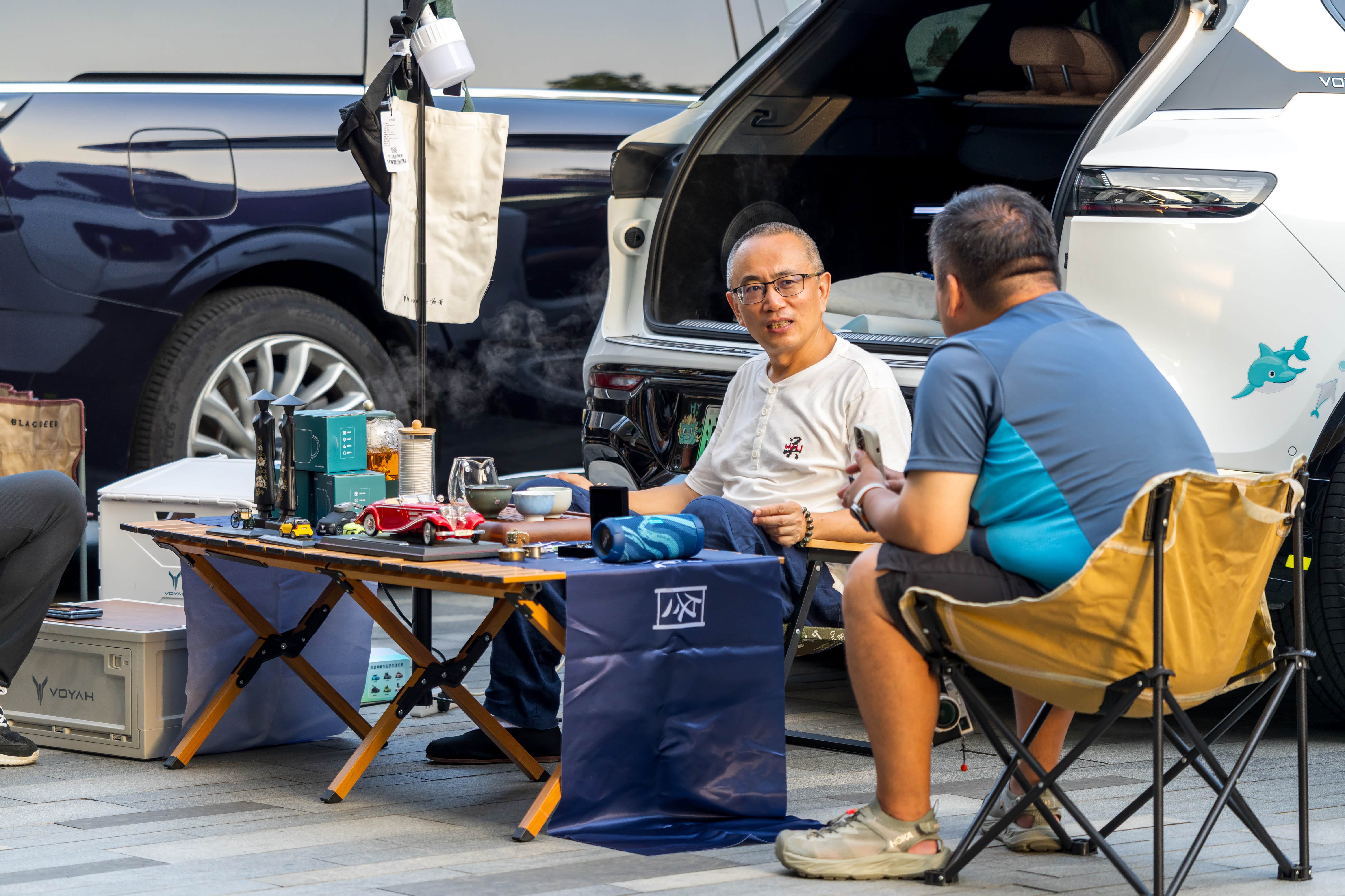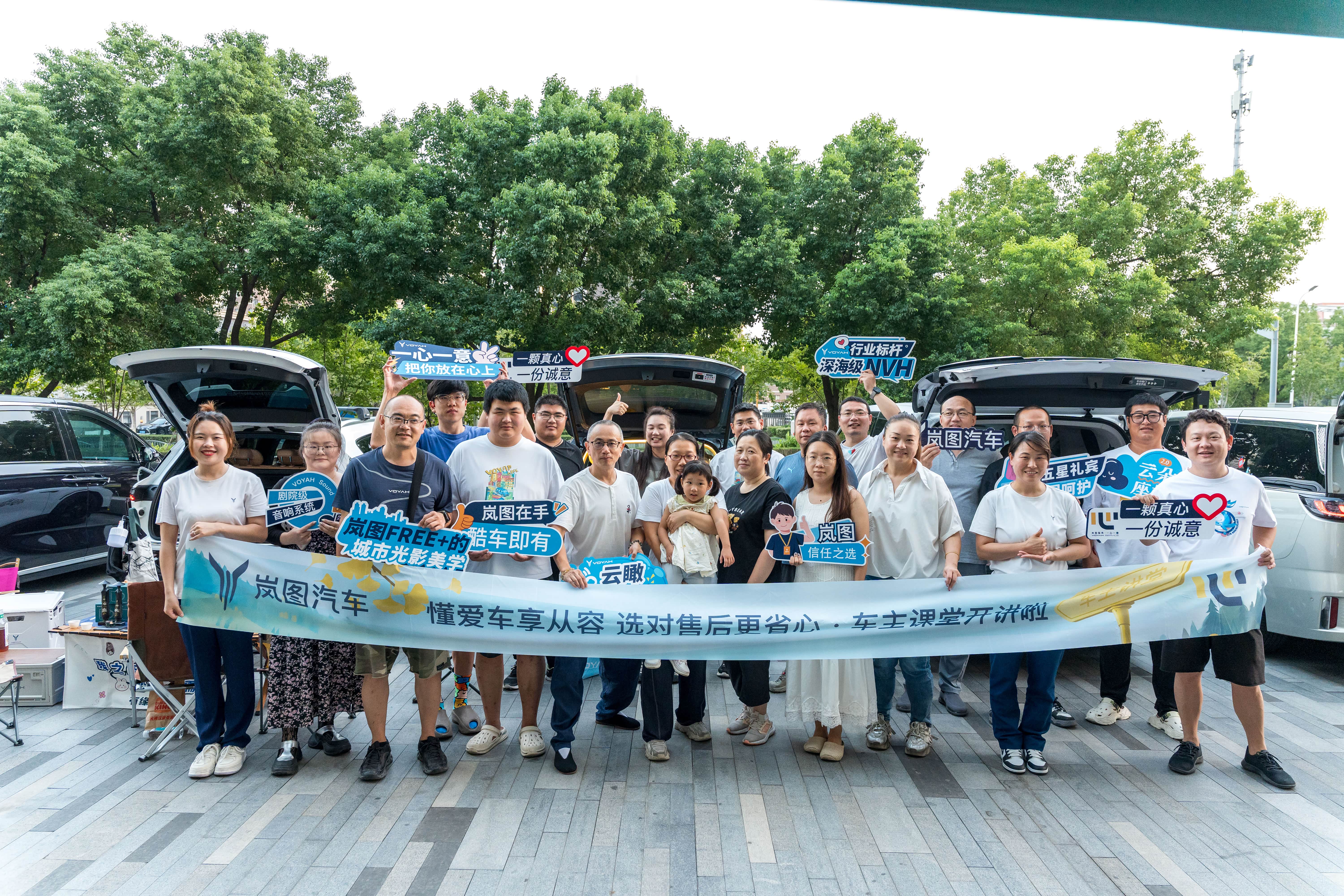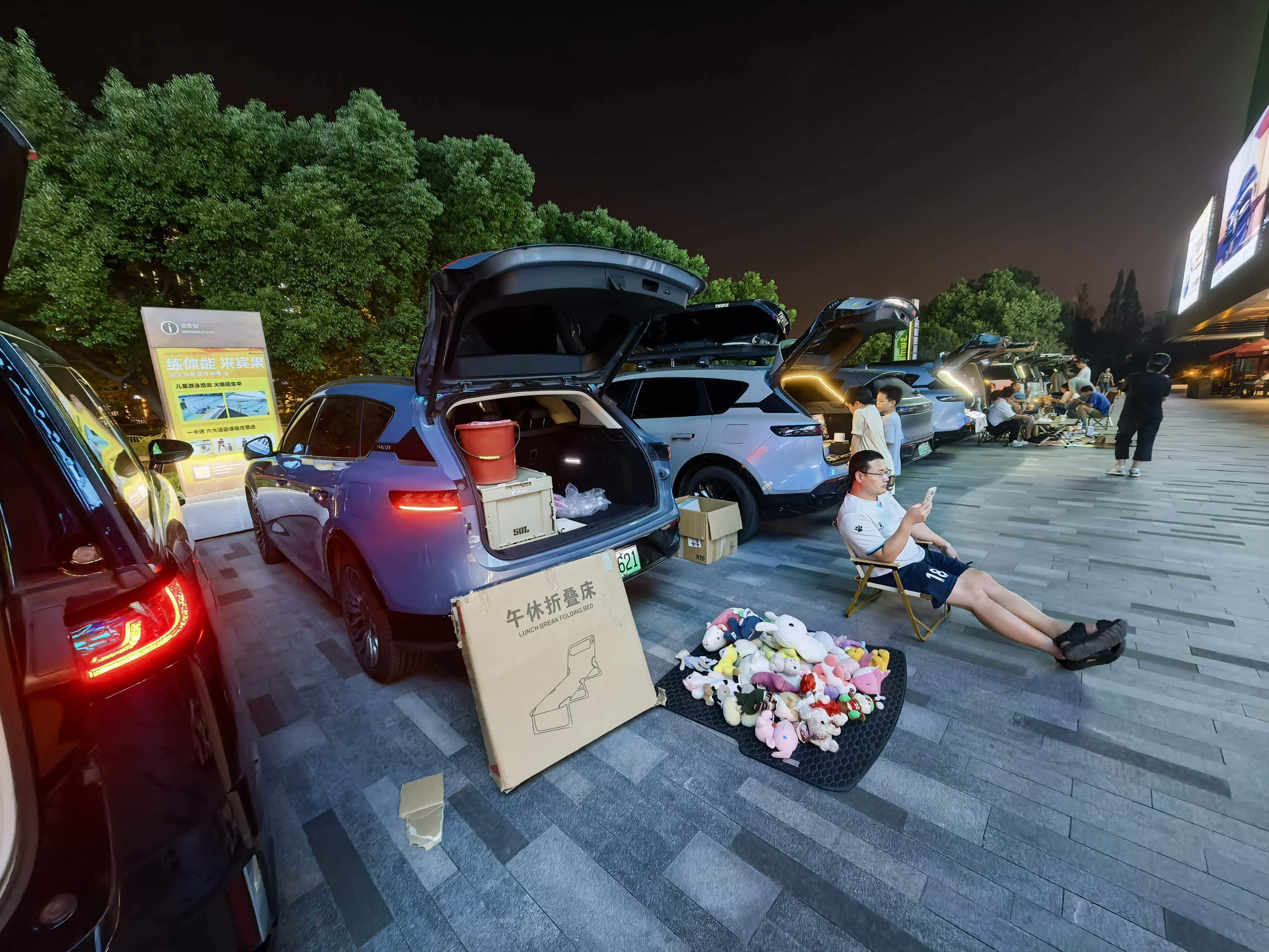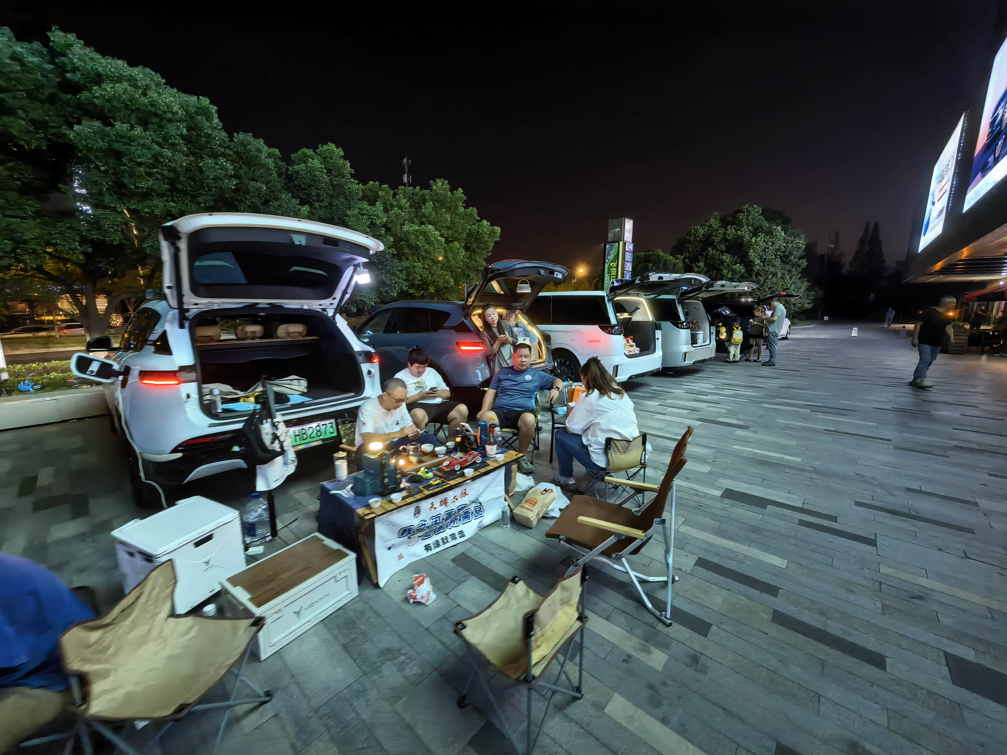 很多车友们也没闲着,没人逛的时候就互相串场聊天。有位开梦想家的大哥跟我聊,这是他第三次参加岚图线下活动,上次露营就特别热闹,咱们品牌虽然不比老牌子,但车主之间像一家人。正说着工作人员推着小推车来送水,还组织我们拍大合影,看着二三十辆车排成一排大家很开心。