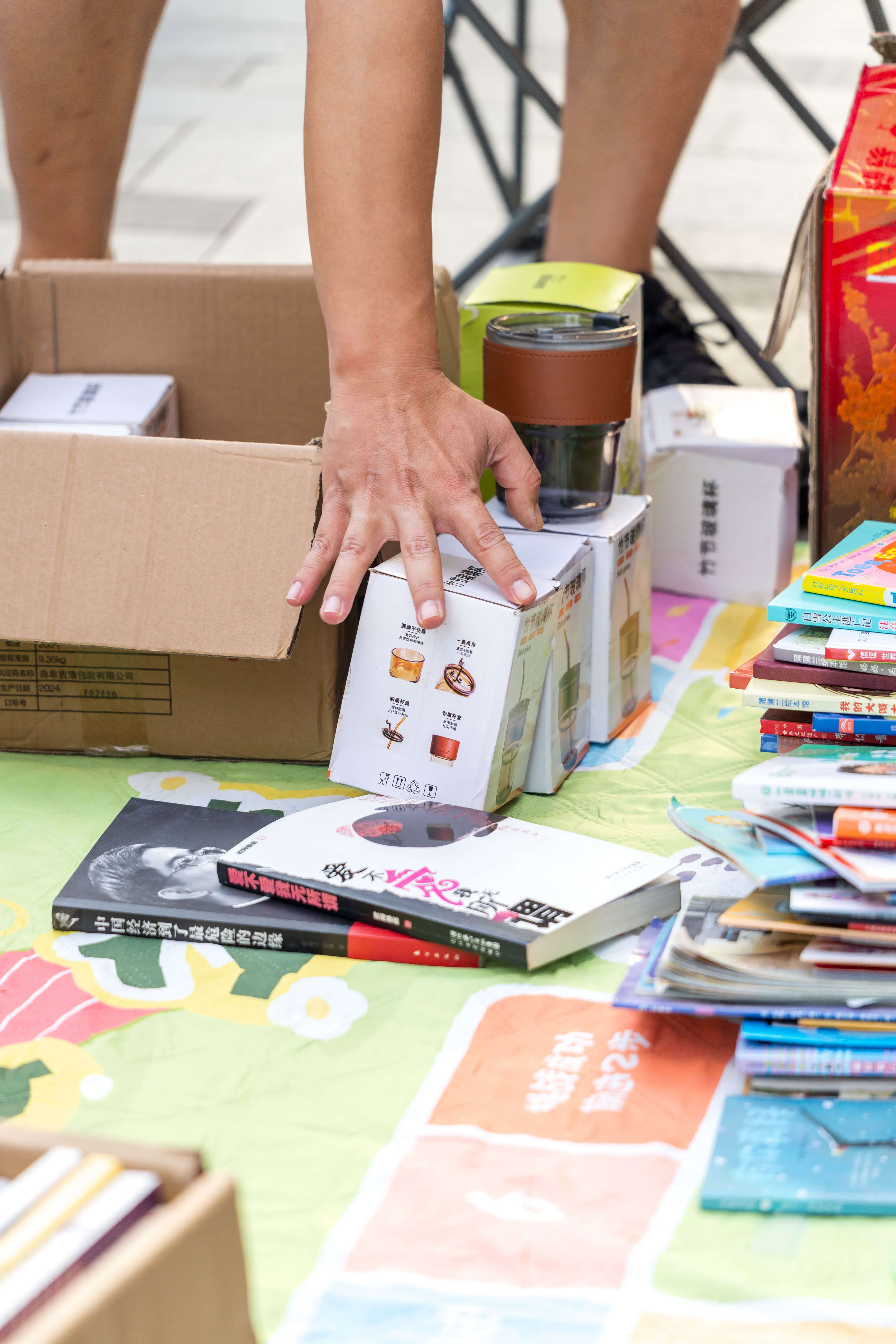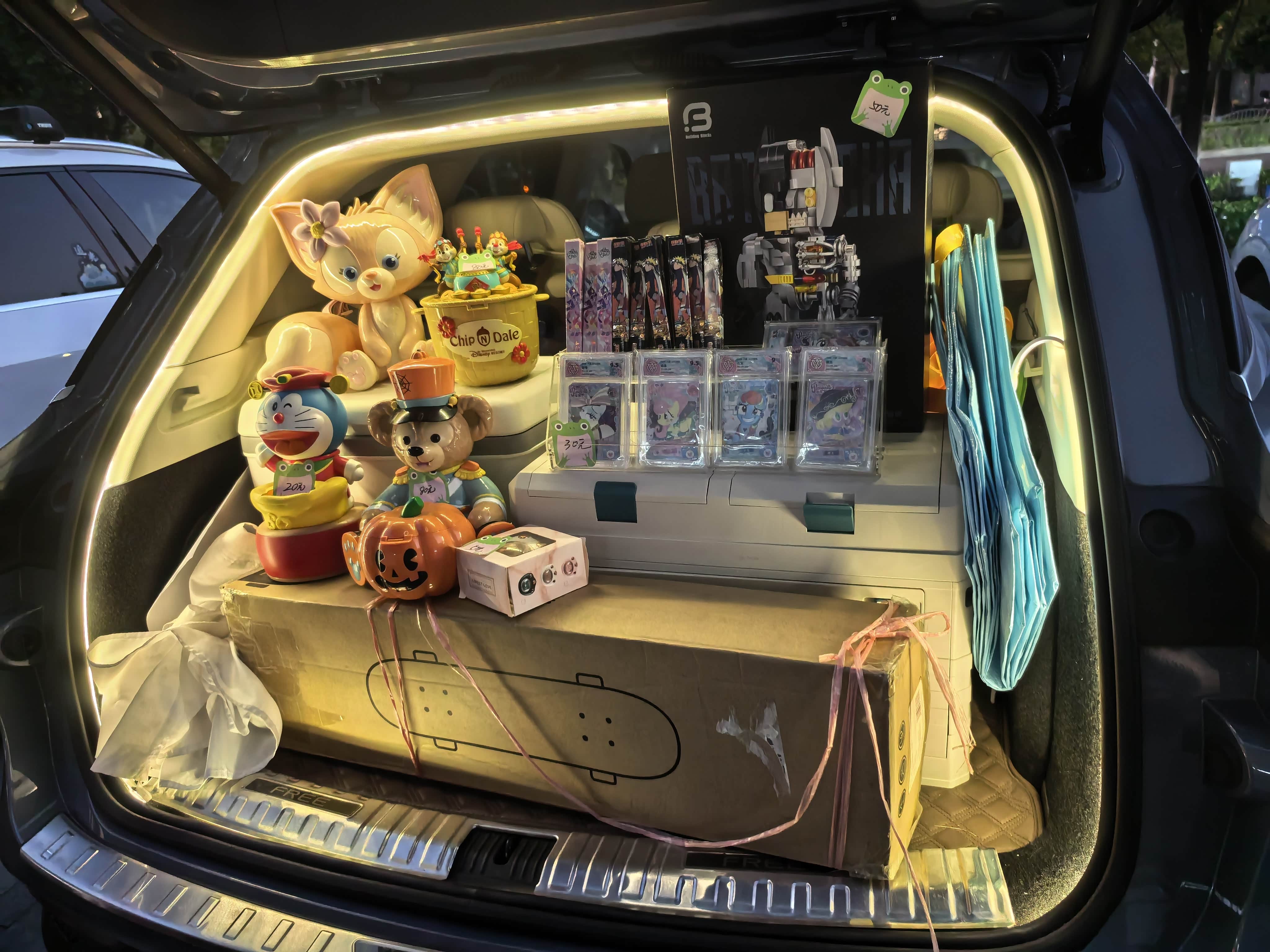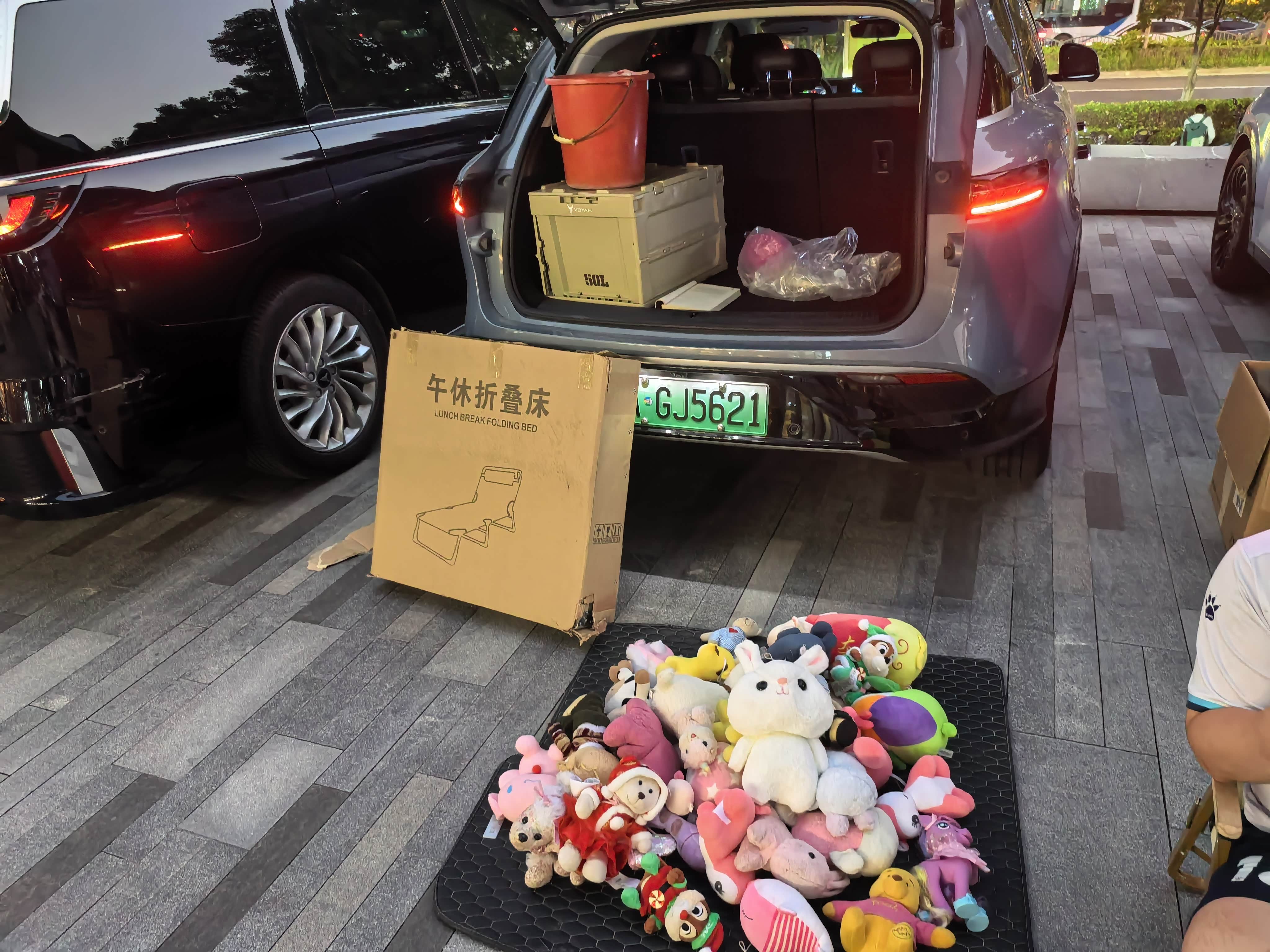 下午四点活动开场,二三十辆岚图车沿着商场外墙排开,打开的后备箱像一个个小宝藏盒。我旁边的大哥是手作达人,后备箱里摆满自己刻的木头小兔子、捏的陶瓷杯,他说退休没事干琢磨的手艺,卖多少钱无所谓,能帮到孩子就好另一边大姐更实在,儿童绘本、女儿穿过的小裙子洗得干干净净、熨得平整,孩子长得快放家里占地方,不如给需要的人。我也赶紧把东西摆出来,找工作人员要了张纸写价格,玩具10-20元随便给,书5元一本,心里就想着能多凑一点是一点。