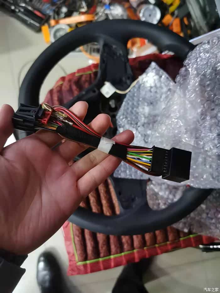 顺便也回顾一下那个有故障的方向盘,来看一下结构,它比普通的多两组线束,这就是加热线。