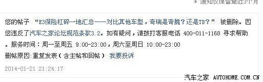 我再次复制删帖时我收到的通知:“您的帖子 “E3保险杠碎一地汇总——对比其他车型,奇瑞是奇脆?还是TB?” 被删除。因您违反了汽车之家论坛规范条款3.2。”