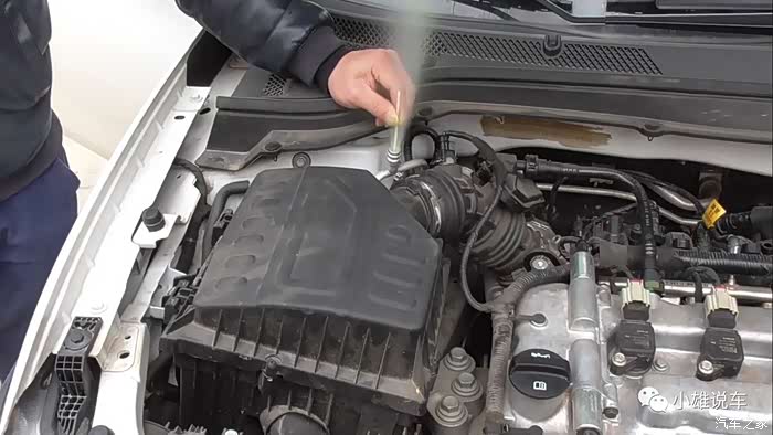 然后就检查有没有制冷剂,也就是冷媒,如果没有检测表的话就只好找个东西往这个口这里顶一下里面的气门芯了,根据压力和喷出来的制冷剂就可以来判断的。