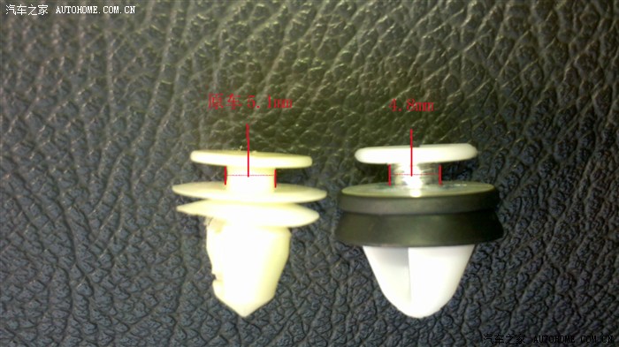 在做隔音的时候就发现,门上的卡扣并不能和门有紧配合,始终有一点松垮垮的感觉,所以当时在卡扣上粘贴了一圈橡塑,已达到配合紧密的效果,通过这段时间的验证,效果确实明显,但是始终觉得粘贴的橡塑可靠性不好。最近某宝掏东西时无意发现了带皮碗缓冲的卡扣,而且也是用在东风其他车型上的卡扣,卡扣长度和风神一样,所以果断入手40个。到货后 对比发现,除了卡扣脚的直径小0.3mm,其他各参数是一样的,所以改进这个卡扣,让他更适应我们的车。