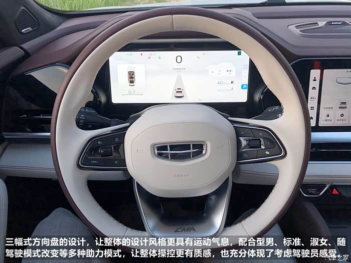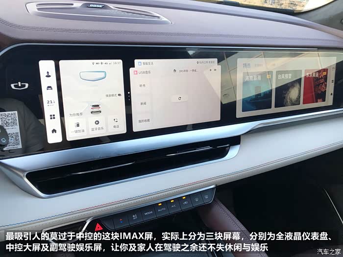 内饰方面,星越L配备了由三块屏幕组成的IMAX大屏,车内顶配及内饰部分分别采用了翻毛皮及真皮的包裹,车厢内的豪华感油然而生。