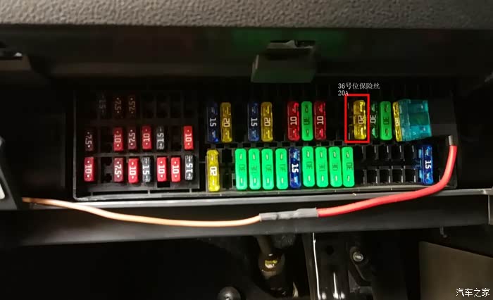 这是位于驾驶位下方的保险丝盒,轻拉小盖板后就可以看到,图中红色方框的黄色保险丝就是36号位置,用小盖板上附带的小工具就可以拔出
