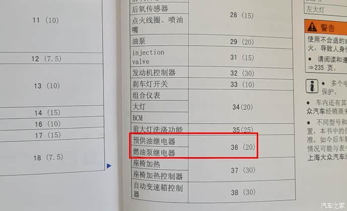 随车说明书上提示燃油泵继电器的保险丝是36号位置,20A的