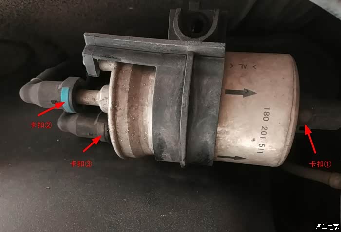 图示是连接汽油滤芯的3根油管,每个油管都有卡扣,拆卸方法:按住卡扣后拔出油管