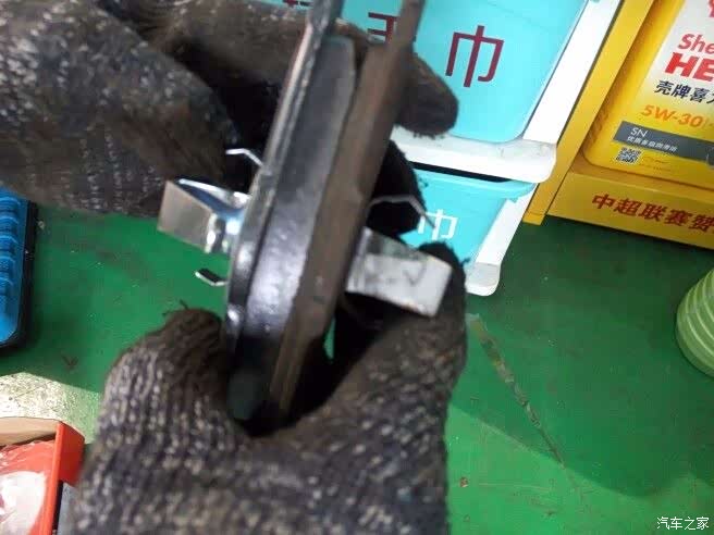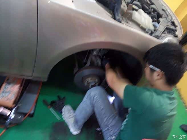 店家包安装,虽然自己认真自学一下也会装,但还是交给更专业的人来吧,我在旁边认真观摩,说不定下回自己也能换了。汽修店的师傅手艺好,换起来得心应手,下面我们具体看看换片过程,手机拍的图、拍的不好还请大家多多包涵。