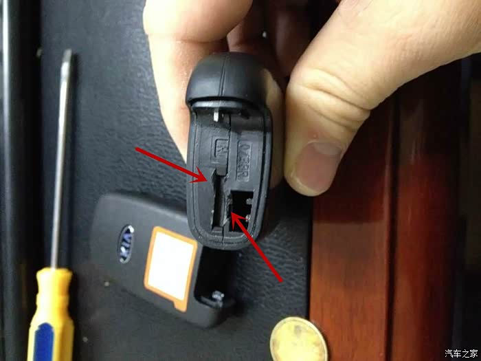 这个是新的备用钥匙,合理方向用力是无损的。钱币放入后用力方向按箭头来用力!就不会把中间的隔弄断。轻轻试着用力,上面便开了 开了后围绕钥匙一圈缝隙 慢慢掰开,便整体打开了!注意不要把钥匙固定扣上面取钥匙按键的弹簧和白色橡皮接触面弄掉了! 换好好之后对齐按紧便可以正常使用!为了不让大家像我的第一个钥匙样发来分享一下!