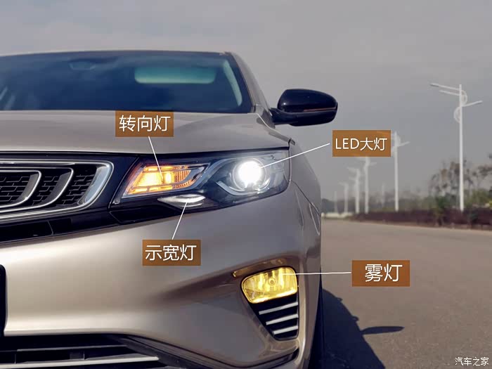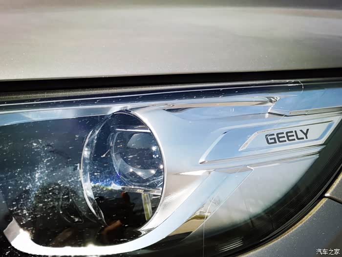 远近一体的LED透镜大灯,大灯里面有GEELY的标识,精致有型