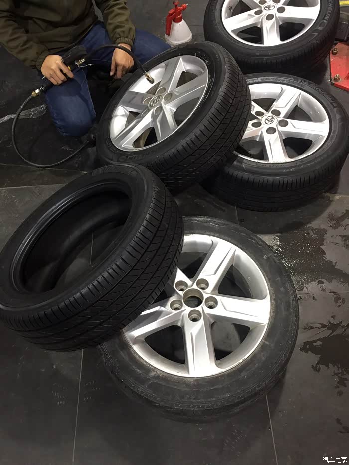 换4条新胎,然后备胎换了个旧点的轮毂,就是总共换5条胎的工夫。跟师傅说了一下就爽快答应了,不用加钱,因为听说别的店会加钱。
