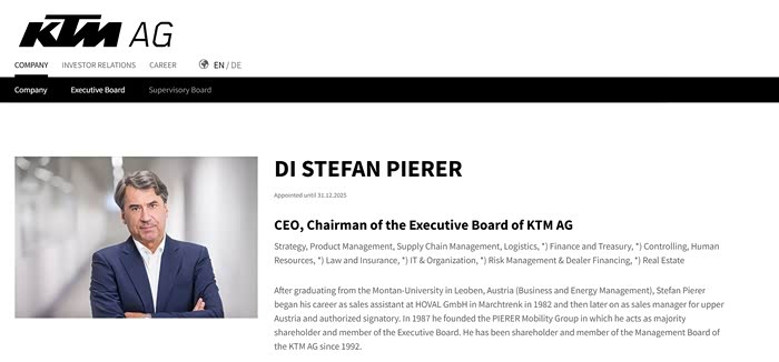KTM AG首席执行官斯特凡·皮埃尔(Stefan Pierer)表示:“过去三十年,我们已经成长为欧洲最大的摩托车制造商。我们的产品激励了全球数百万摩托车骑手。现在我们正在为未来稍作休整。KTM品牌是我毕生的心血,我会为之奋斗。”