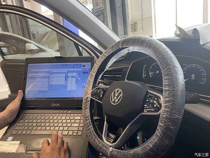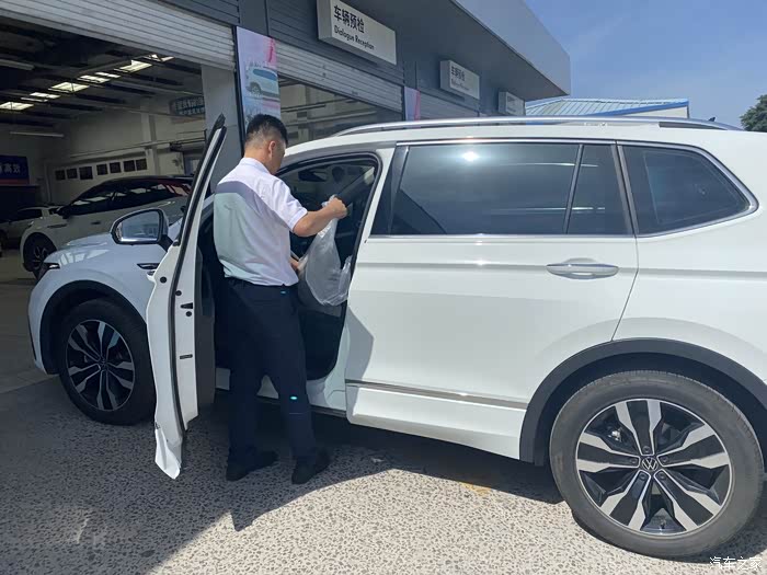 确认好二保需要做保养的项目后,售后帅哥给座椅和方向盘铺好一次性保护膜准备开到保养维修车间。