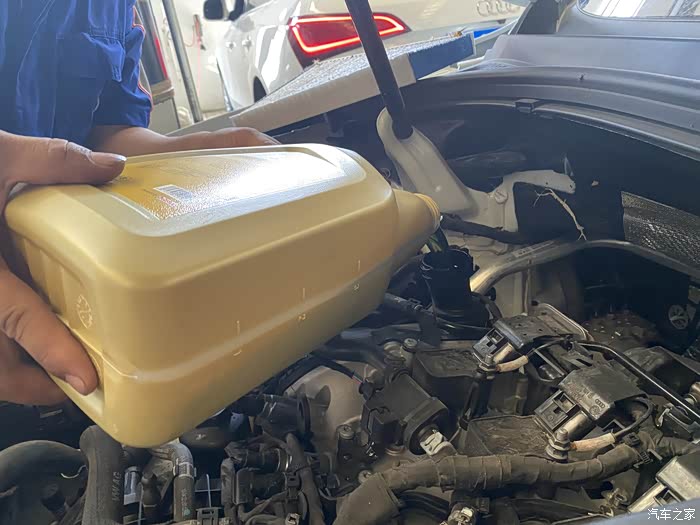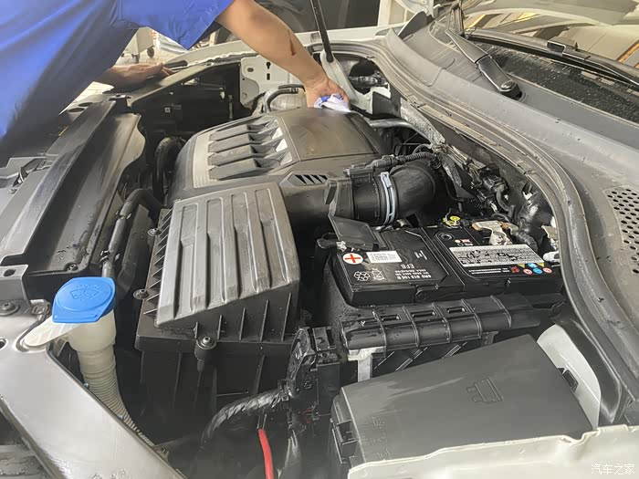 进车间以后工位还比较紧张,就先停在一侧打开发动机舱开始保养了。