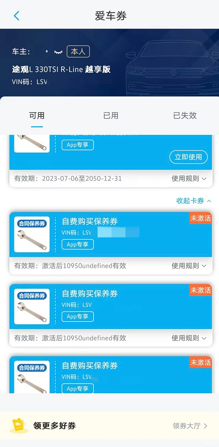 售后帅哥在我首保的时候就推荐过店里的活动,机油75折的基础上,一次性预订三次保养可以赠送一次,所以折算下来使用全合成机油每次只需797元,比半合成机油仅多出112元,我感觉挺合适的就在大众APP上购买了全合成机油的保养卷。