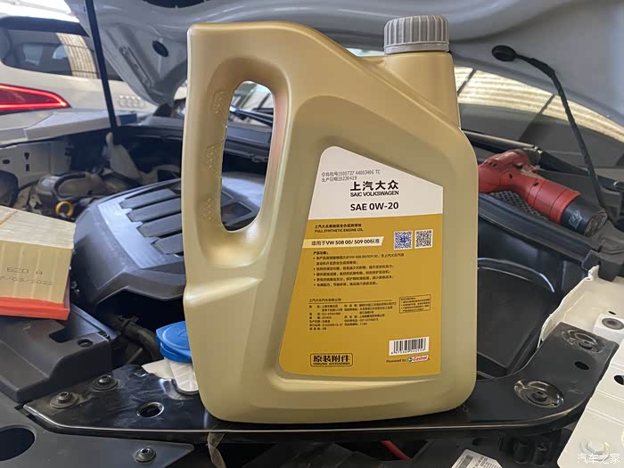 这就是我这次二保要换的全合成机油。相信拥有大众车的车友们都有这样一个感觉,之前都是用5W-30或者5W-40机油,换代后都采用了0W-20的机油,其实使用0W-20的机油,主要是为了满足国家对于排放的要求,做着保养一边跟师傅聊,他说这款全合成机油,是符合大众汽车最新标准的低灰分机油(一开始听着这个词还挺绕嘴),可以有效的减少颗粒物的排放,从而达到国家的排放要求。