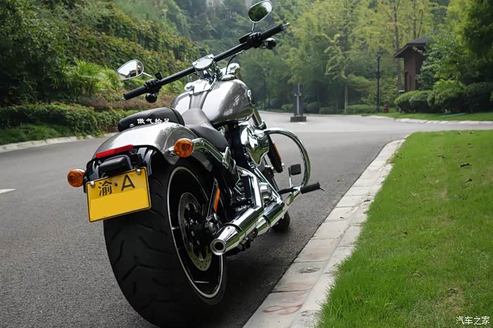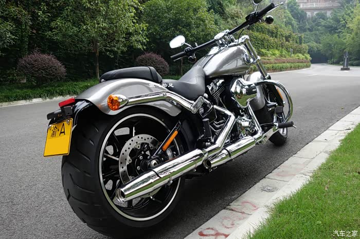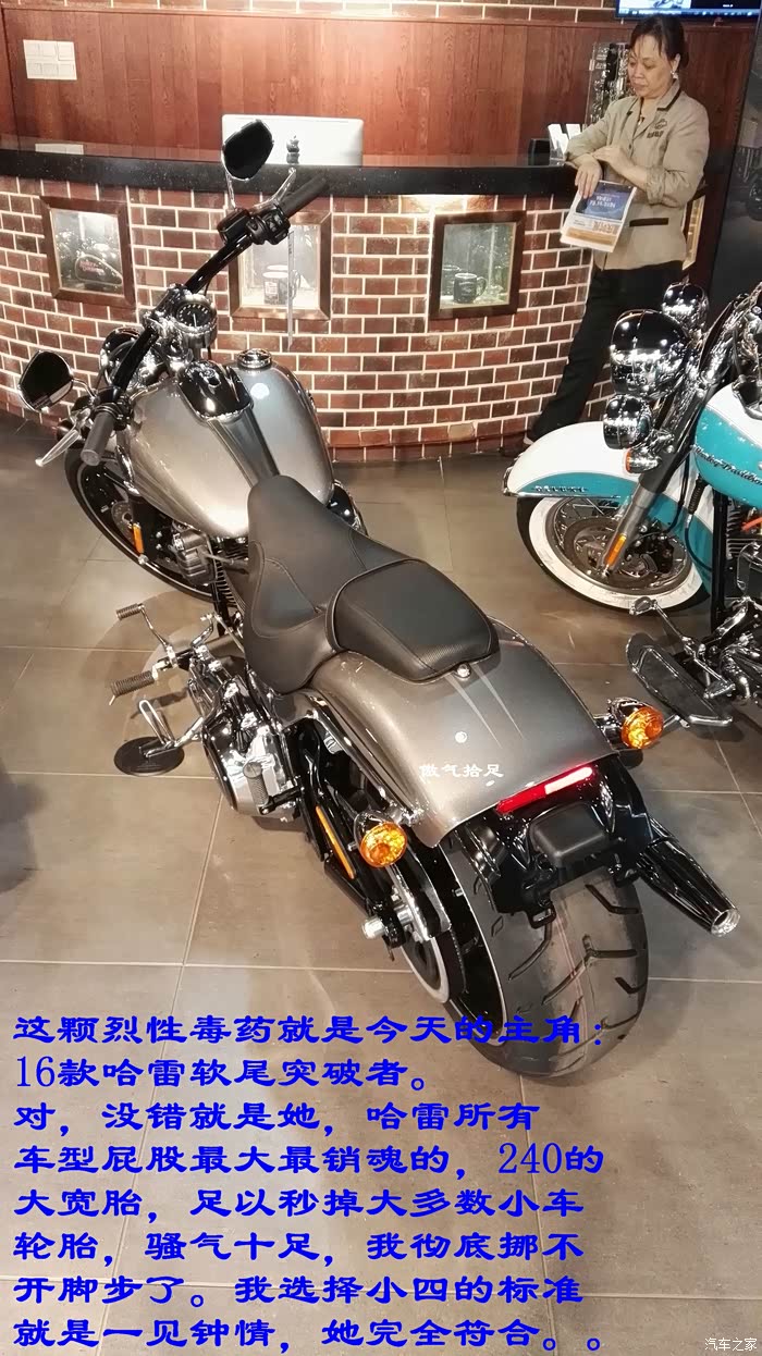 这颗烈性毒药就是今天的主角,16款哈雷软尾突破者。对,没错就是她,哈雷所有车型屁股最大最销魂的,240的大宽胎,足以秒掉大多数小车轮胎,骚气十足,我彻底挪不开脚步了。我选择小四的标准就是一见钟情,她完全符合。
