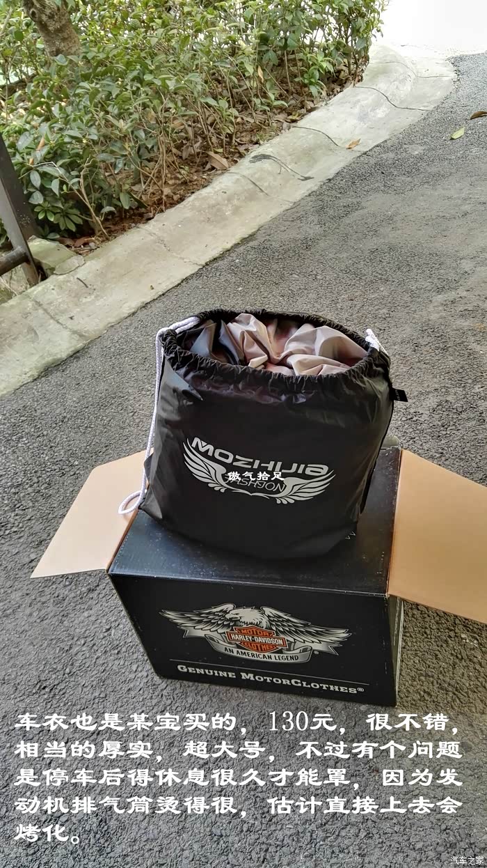 车衣也是某宝买的,130元,很不错,相当的厚实,超大号,不过有个问题是停车后得休息很久才能罩,因为发动机排气筒烫得很,估计直接上去会烤化。