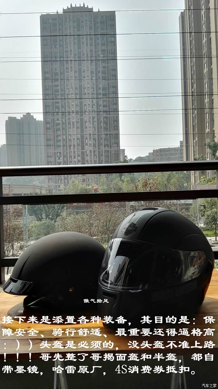 接下来是添置各种装备,其目的是:保障安全、骑行舒适、最重要还得**高:))头盔是必须的,没头盔不准上路!!!哥先整了哥揭面盔和半盔,都自带墨镜,哈雷原厂,4S消费券抵扣。