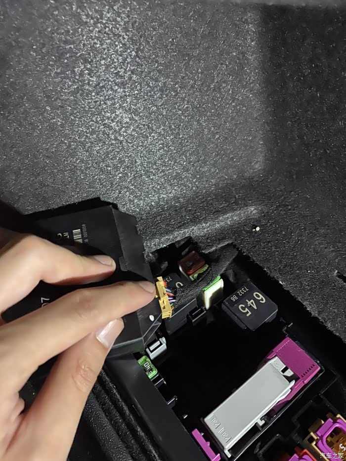 底下有个按钮,轻轻一按,线就可以拔掉,插上买的新模块即可,旧的建议不动继续放在里面,再把新的塞在里面即可,如果要把旧模块拆下来就要把保险丝盒拆下来比较麻烦不建议