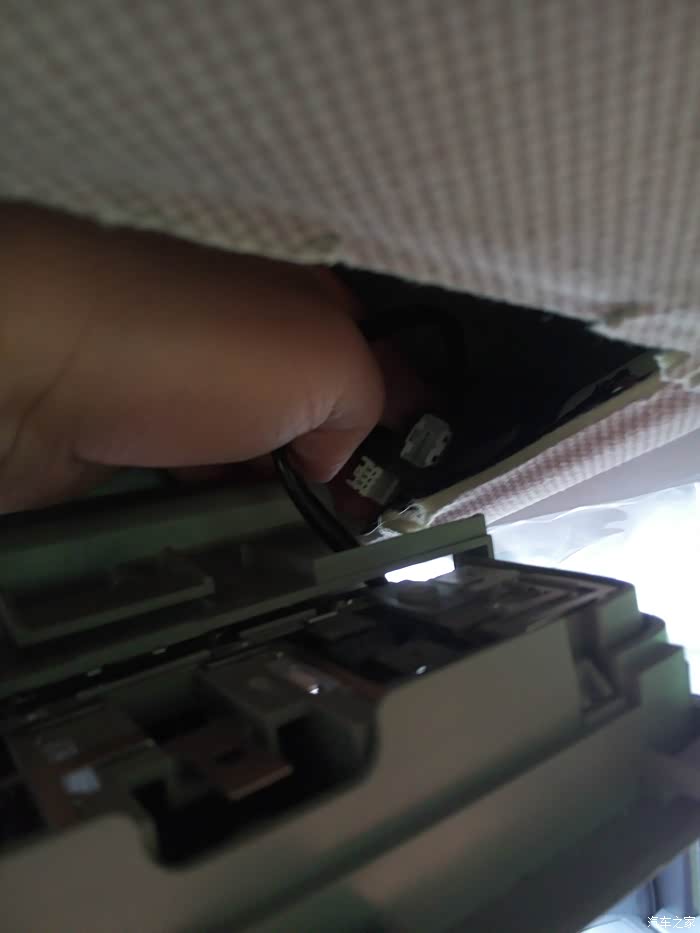阅读灯接电图解,就是里面这个白色的线,下边这个,从网上买了根专用线,70多还是80多忘了,不便宜。不过好处是不用破线。费了半天劲才弄开这个阅读灯,是整体拿下的哦,只扣开阅读灯是找不到线的。