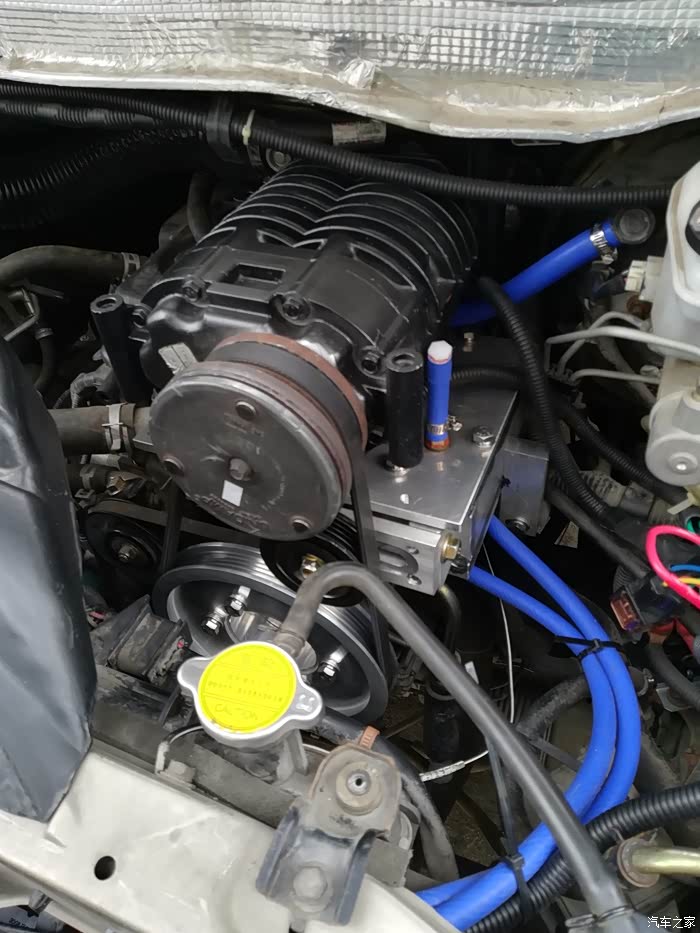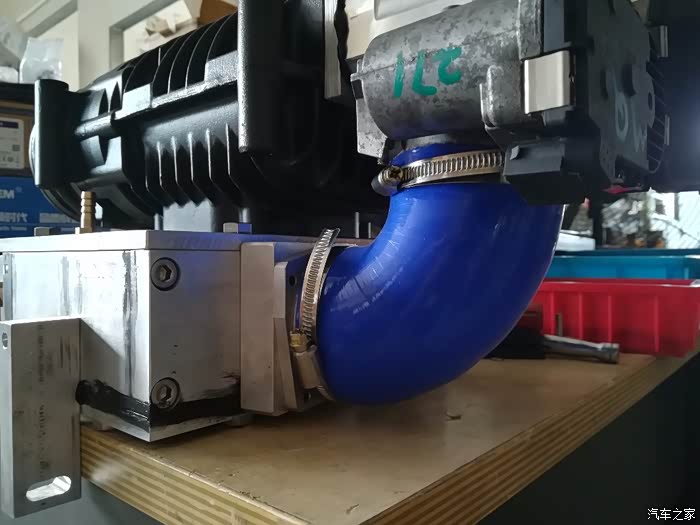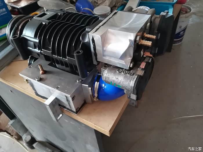 用铝材加工一个进气室,这是整个机械增压系统组装完成的效果。