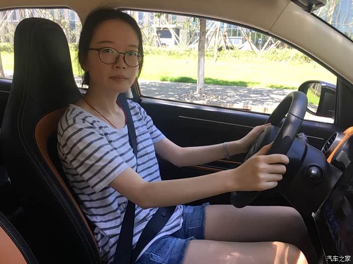 坐进驾驶座,系好安全带,熟悉一下方向盘,不过电咖的座椅还是比较舒服的,而且内部空间也比较大,可以看到女友头顶和腿前方还有很大的富余,美美的来一张。