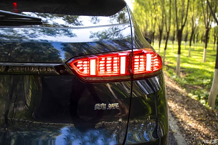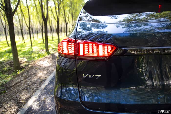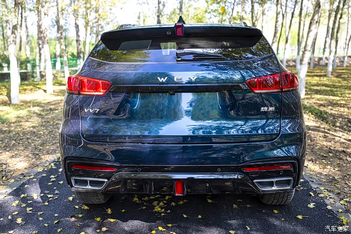 尾部的造型比较的动感,两侧圆形的尾灯由亮黑色装饰条连接在一起,提高了整个车尾视觉上面的宽度,设计辨识度很高,布局上很合理,作为国产高档SUV车型,突破了很多之前SUV的设计上的条条框框,特别是双边四出的排气也是十分的运动和豪华,而且看上去非常的夸张和霸气,我想如果是在另外的车里看WEY VV7的四出排气,更直观的感受就是,这辆车肯定不是好惹的!整体设计上充满了性能和力量,新车两侧狭长的尾灯由中间的亮黑色装饰条相连接,提高了车尾的视觉宽度。
