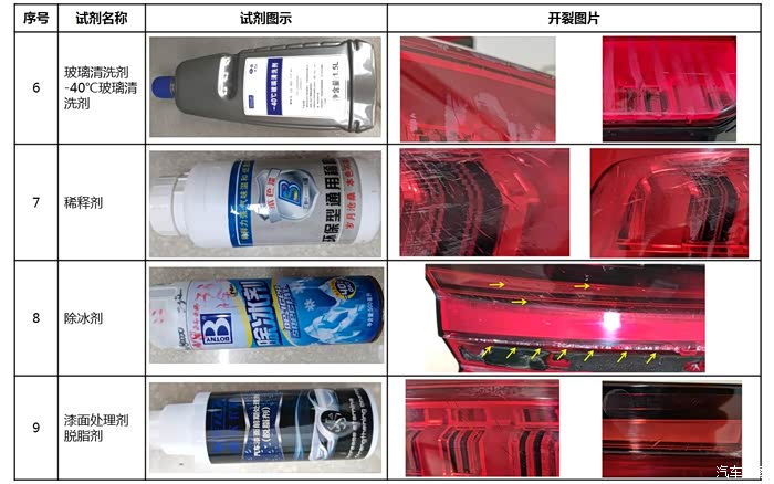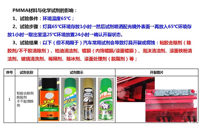 为了验证哪些汽车相关的试剂与尾灯灯罩接触,会导致灯罩腐蚀、发白、开裂等现象,本人进行了一系列的试验验证,验证结论就是尽量不要使用各种品牌、名称、功能的试剂与灯具接触。特别是以下已经验证开裂的试剂,杜绝与灯具接触,否则会给你带来经济损失;