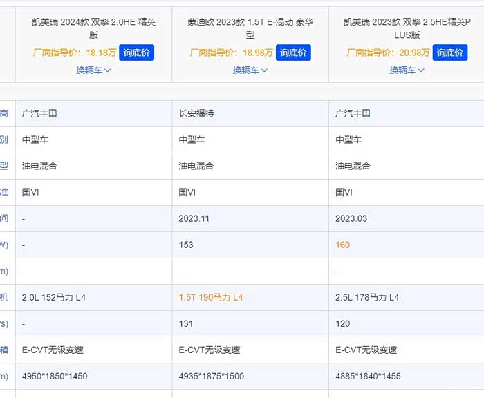 看了一圈现在市面上的油电混动车子,目前觉得新蒙1.5T混动版和第九代凯美瑞双擎版本还不错。现在第九代凯美瑞还只是预售,我觉得18.18万元起售价还是蛮香的。最重要的是第九代的工况油耗值比第八代低了0.38L,直接给干到4.2L/100km了。但我说认真的,油耗确实是低了,但是动力性能也比第八代低了是什么鬼?178匹马力被砍到152匹,广丰你是有什么心事吗?动力参数确实有点不够看。而新蒙1.5T混动版就更有看头一点,虽说厂商指导价比第九代凯美瑞高,但动力性能比凯美瑞强啊!190匹的马力算是1.5T排量当中比较强的了,而且工况油耗也不高,3.81L的成绩比凯美瑞还低。