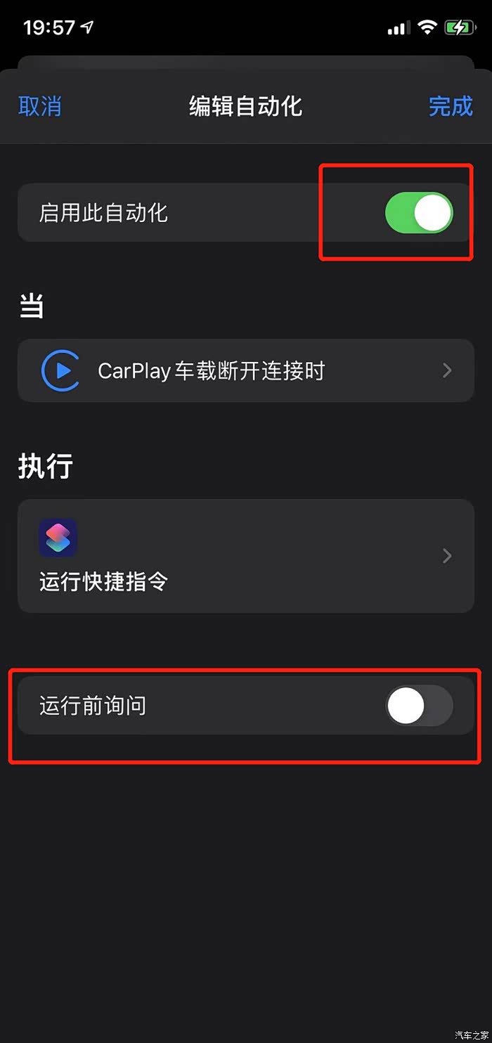 7. 下次下车后carplay自动断开,并自动运行此快捷指令,在你要离开时,自动锁车并在手机上通知锁车结果,如果车窗、天窗等没锁好,会鸣笛报警提示,手机同步推送