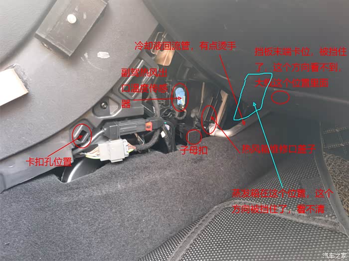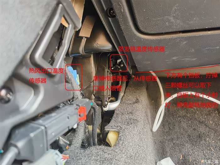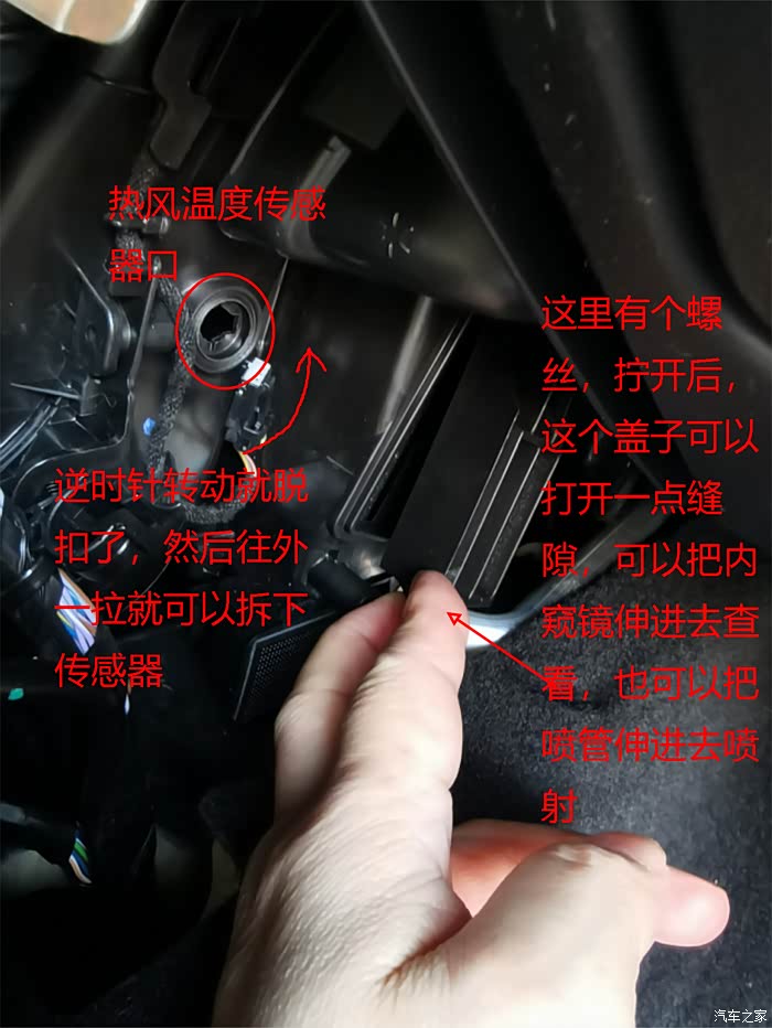 图中,右边是散热箱,有个盖子,手指处有个螺丝,可以拧下来,把盖子拉开一点,查看内部。左边温度传感器位置是副驾座椅下出风口,传感器拿掉后,传感器口可以伸进去喷管。最初我以为这里是冷风口,后来才知道是热风,热风管道干燥的,不用喷。这个图片给大家参考吧,了解一下就可以了。