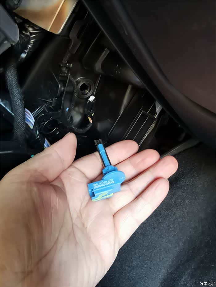 另外,传感器身子也不是直的,是弯曲形状的,下面有图。所以往外拿的时候,要转动着身子才能出来。副驾手套箱下方有个挡板,必须取下来,不然手很难伸到这个传感器位置操作。由于这个传感器位置比较靠里,不往里看看不到。