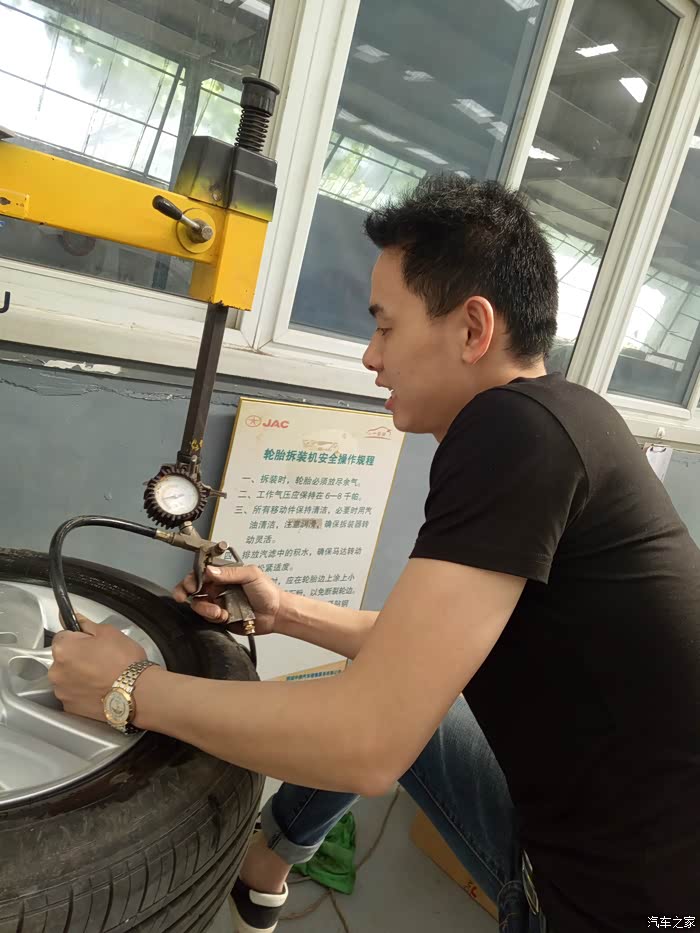 给轮胎充气,这姿势,不过这小伙长得不赖,活干的也挺利索,
