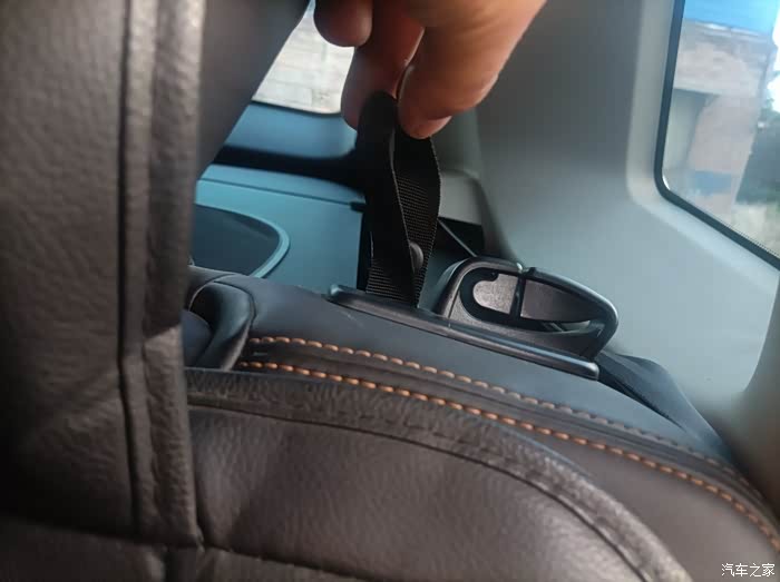 掏出来以后,向上提拉卡扣旁边的带子。提拉起来以后就能将后排座椅向前放倒。