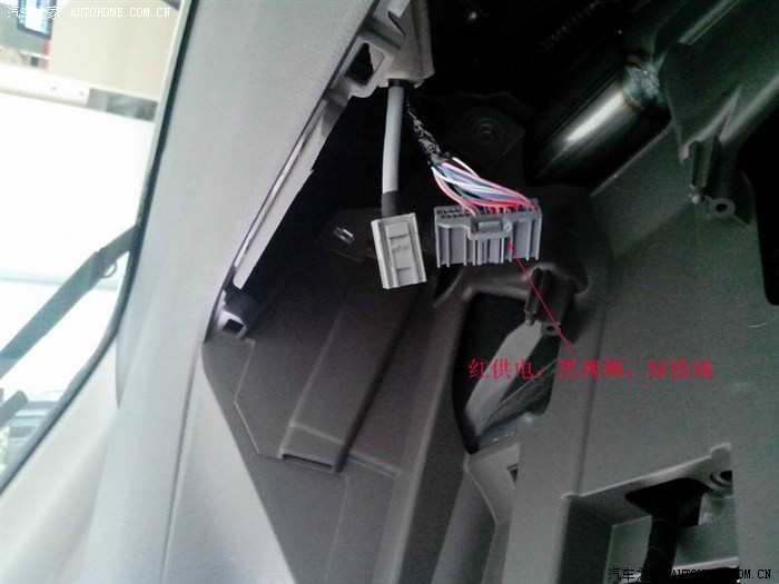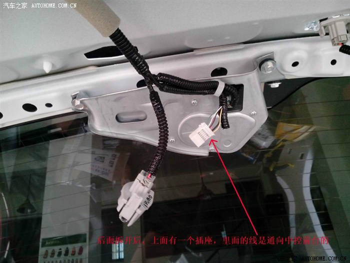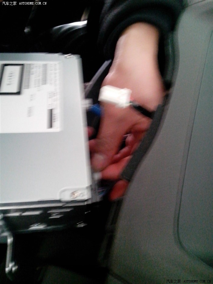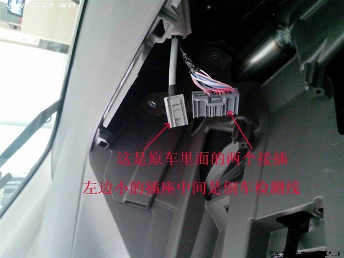 拆下中控后,里面可以看这两个插座,小的中间是检测线的,大的里面的线头可以与后面的一个插座上线相通,原车的线本来是厂家用来方便装导航的,这里可以用来直接装倒车小屏,否则,你要是自己接线到后面,穿线是非常麻烦的,而且,倒车灯的线也要破线,很不方便。
