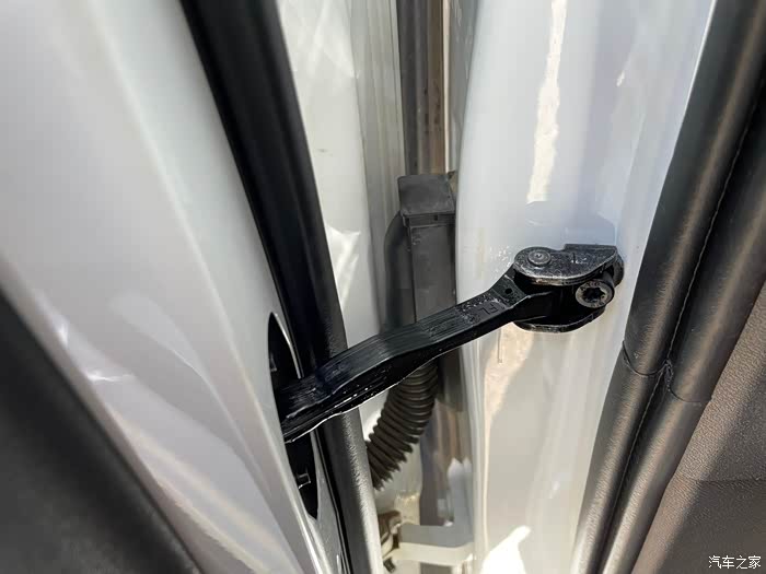 如图,前门共3处连接点,三个铰链,经我检查,应该是中间黑色这根铰链(限位器?)的问题