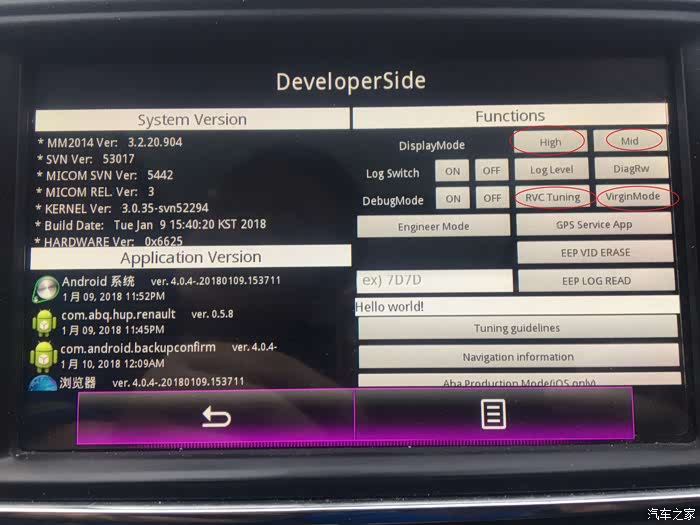 警告:下面的界面很危险,有几个按钮千万不能按,否则会导致车机黑屏、配置全部丢失、屏幕倒置或者倒车影像辅助线错误等故障,而且个人很难完成修复,极度危险,一定要非常小心,出现故障本人概不负责!!!再次警示!!!
