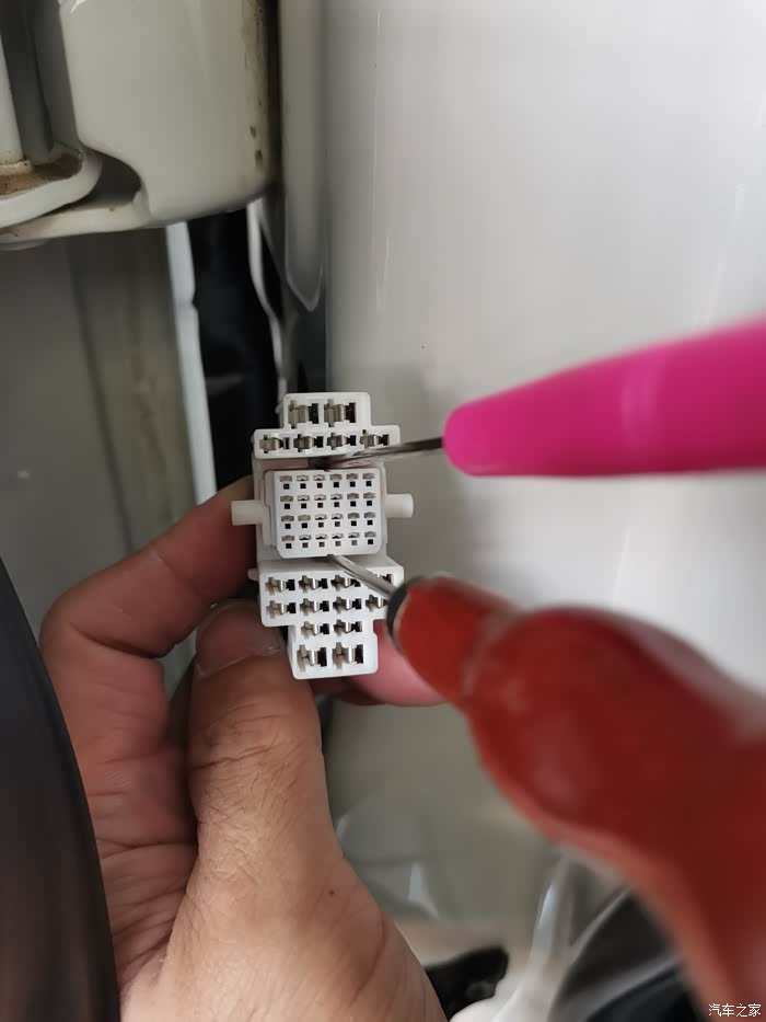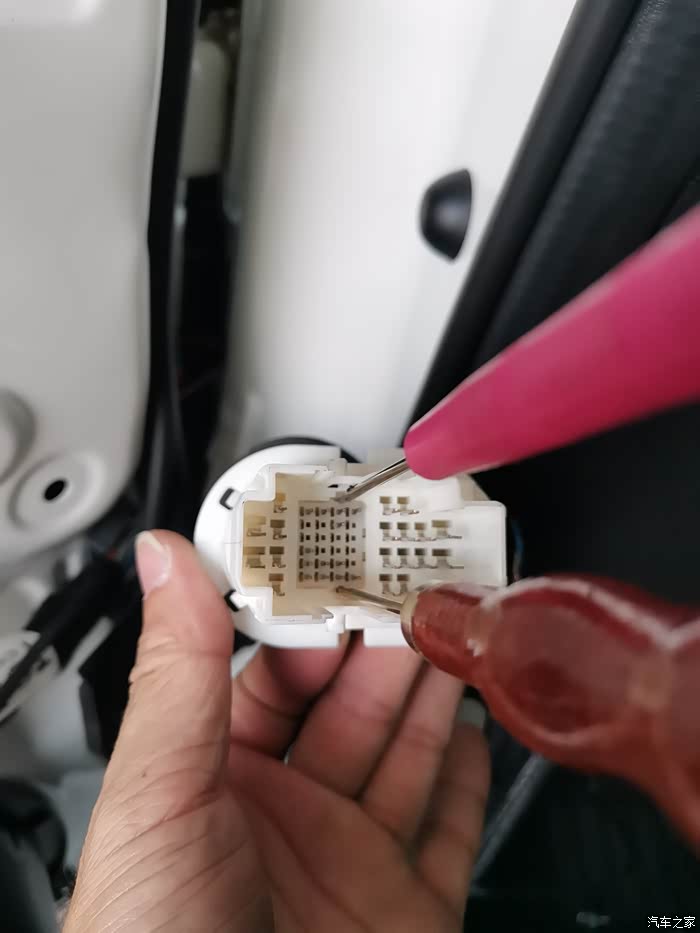 因为过门板主驾驶插头公端和母端插头都是由两部分组成的,要分离才能压小端子,分离方式如图用两根细的锥子顶住两个卡扣就能推出小端子壳了