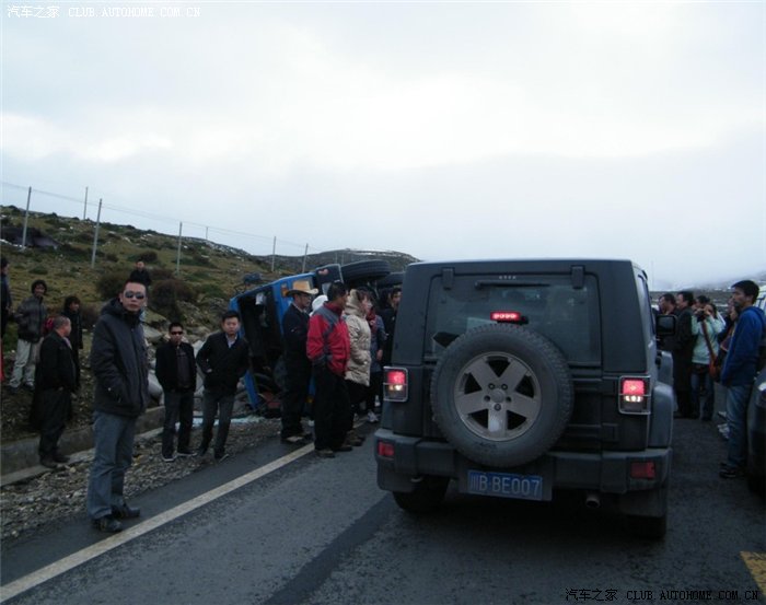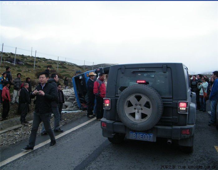 10月3日我们从新都桥回康定的时候,路上在翻越折多山的时候遇见大塞车,大家都很有次序的排好队等待过去,这时一辆绵阳的牧马人开到2个车道的中间,大家都让他往右边车道靠一下,这时他不但不听,还把窗户关了起来,过了差不多7,8辆车后(这些车都轮胎插着路边过去的),这时来了个大货车(当地牌照,藏民开的),过去的时候轮胎不幸划出路边,这下整个车身全部翻倒,造成车祸,这下大家都火了,强烈谴责此人,此人不但不理,还和路人发生口角,这时交警出面,当场没收此人驾照,全责,要求赔付大货车司机,如果这个是悬崖,后果将不堪设想,此人造成了将近1个小时的大堵车,引起大家公愤,强烈要求人肉此人!!!!!!!!不幸的万幸是大货车司机受了点轻伤,当时我离车祸就2米