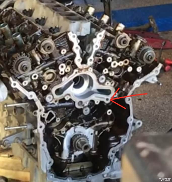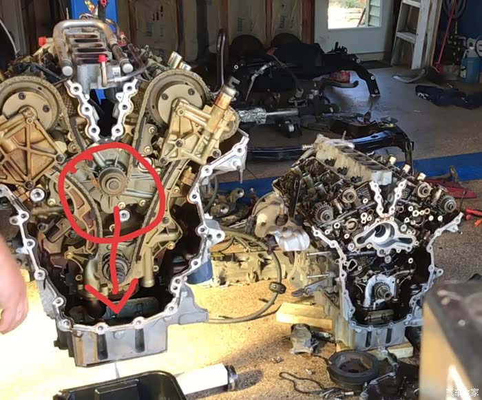 老款3.5 和新款 3.5T的水泵居然是在发动机内部靠正时链条来驱动的。如下图,圆圈里是水泵,再往下就是。。。 发动机油底壳 。 这个水泵被正时链条时刻又一个往上的力拉扯,时间久了,垫圈和水泵的轴承可能会产生泄漏,然后,漏哪里去了呢。。。 油底壳。 所以,机油里如果有了防冻液,这是多么刺激的事情啊。建议3.5/3.5T的车主车子开到10万以后,经常检查一下自己的防冻液位置,或者机油位置,如果有一天发现防冻液减少,机油变多。。。那么快点修。 这个玩意拆拆装装的估计真得搞一整天,还要把机油全部换掉,再用机油冲洗发动机油底壳,中招的真是心塞啊。 (3.5T的比3.5 稍微改进那么一点点。。。 没好到哪去)