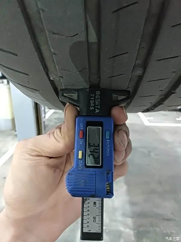 检查车轮的磨损情况,这里会用到专用的检测工具,测量车轮纹路深浅来判定磨损情况。我的小鹏P5是前驱车,电车扭矩大,我又喜欢深踩和急踩电门,导致前轮磨损明显大于后轮。