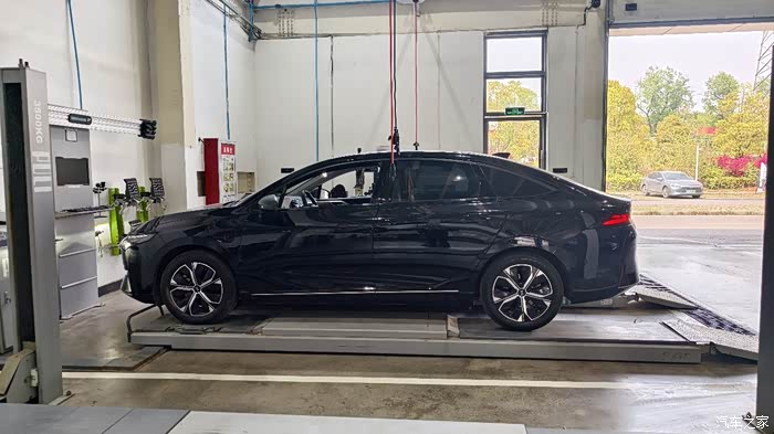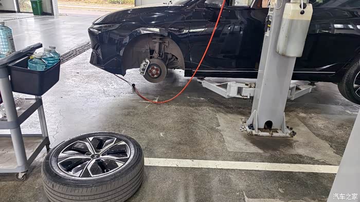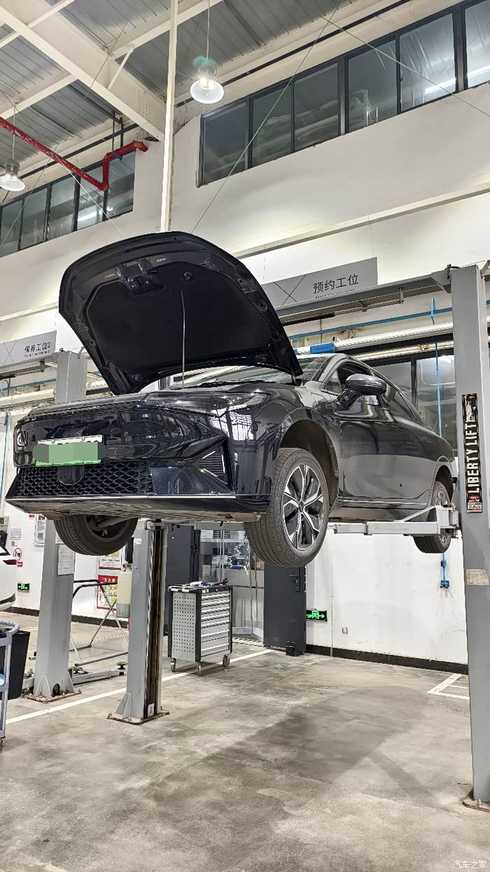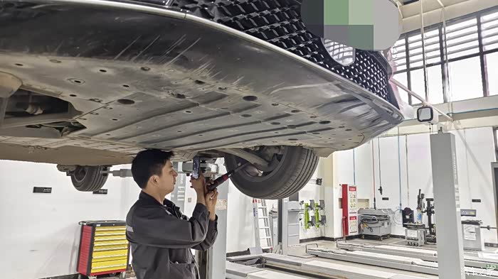 顶起车身,检查底盘,特别是电池板受损情况,这对新能源车来说很关键。