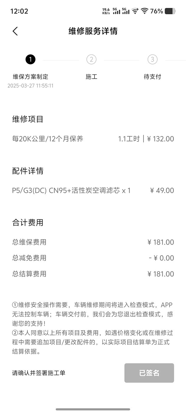 关于价格:小鹏的保养价格很公开透明,在保养开始前就会明码标价跟你确认,只有确认过的才会开始做。我这一次费用一共是空调滤芯49元+132的工时费,一共181元。因为小鹏十周年活动送了我一张空调滤芯的代金券,所有抵消以后只用支付132元即可,还可以用APP发帖赚的积分全部抵扣,现金支付0元。