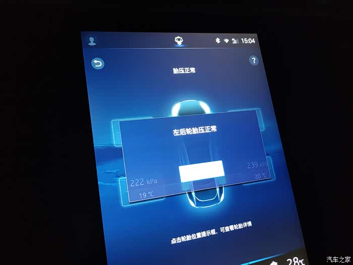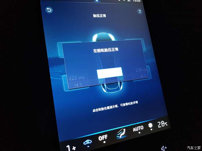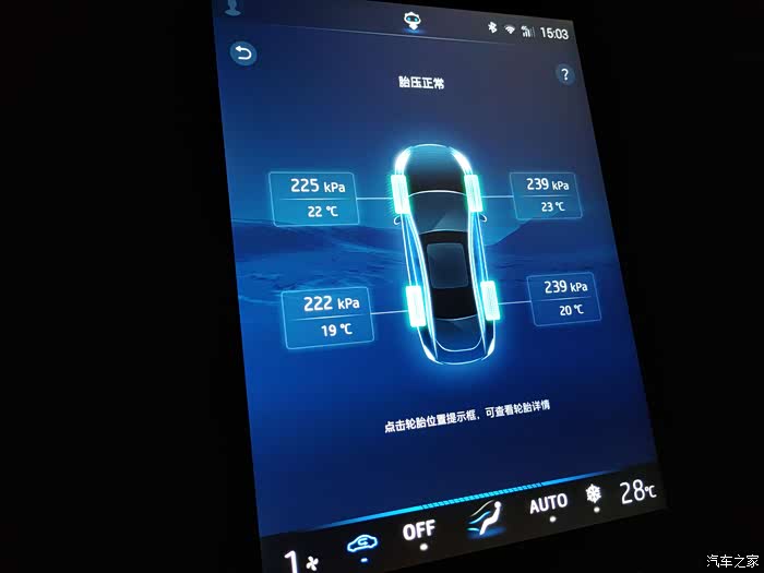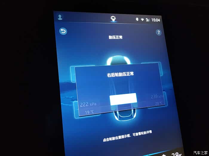 每个车轮的气压都可以看到,还有温度的,要知道现在很多的事故都是和爆胎有关系,而爆胎除了一些外力影响之外,最大的隐患就是胎压了,高和低都不行的,不过我的嘉悦还有爆胎装置,双重保护哦