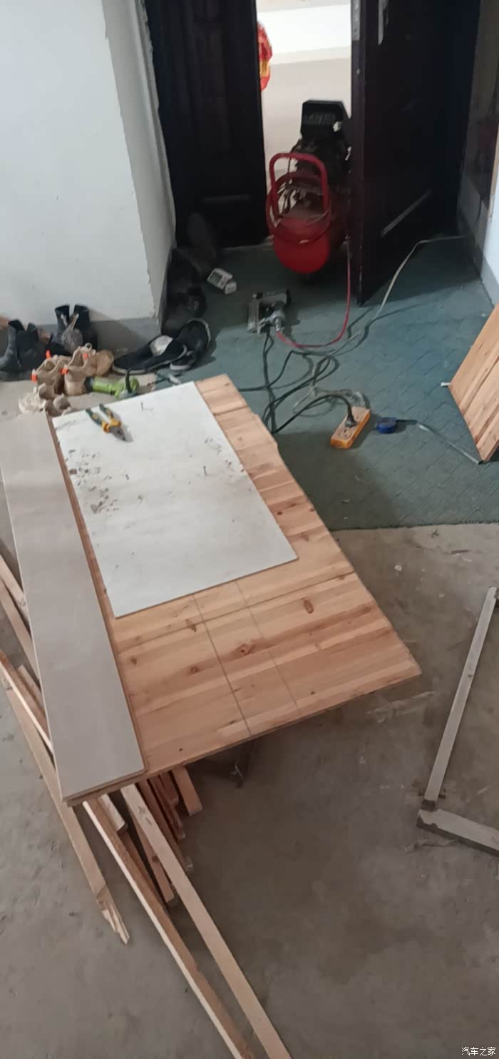 先用激光水平仪。确定一下需要做的箱体的高度,计划比中排座椅要高两厘米。结果做的时候计算错误,忘记了加上底和盖,导致整个箱体比原计划高了4厘米。