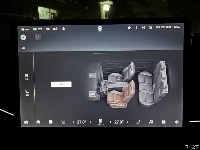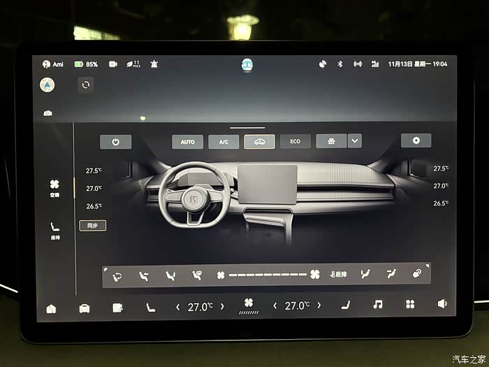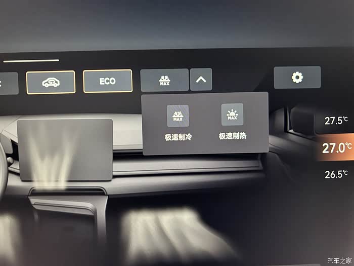 和燃油车最大的区别就是电车的所有控制都在中控屏上。空调的风力大小、温度和摆风也都是根据中控来实现的。