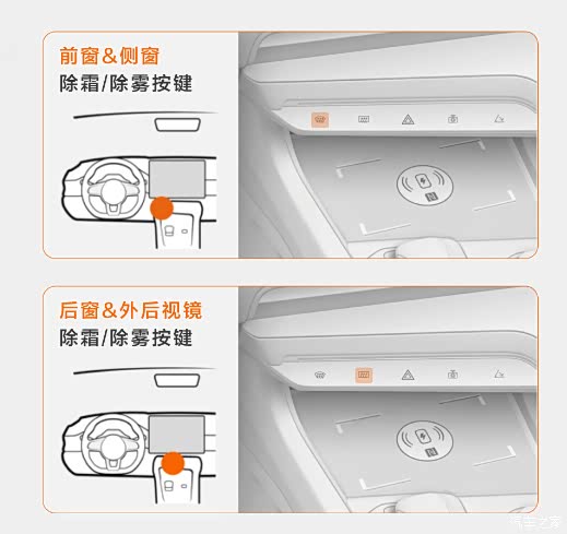 车辆入冬后因舱内外温差增大,玻璃容易起雾。我们可以通过触摸中控下方的除霜/除雾按键,迅速除去雾气,以确保视野清晰,提高行车安全。