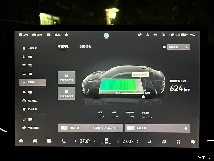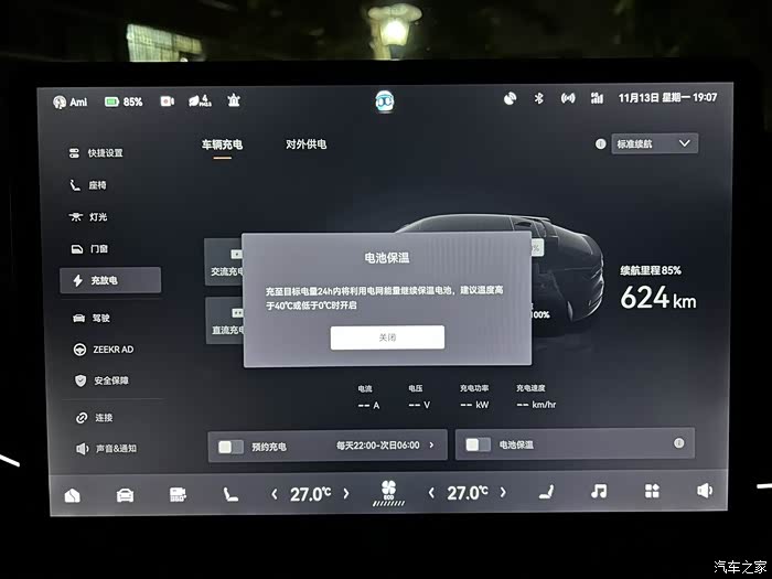 设置方式:在极氪001的设置-充放电页面有个电池保温开关,正常开启即可。这样在冬天户外充电的时候,就不用担心电池温度过低的问题了。